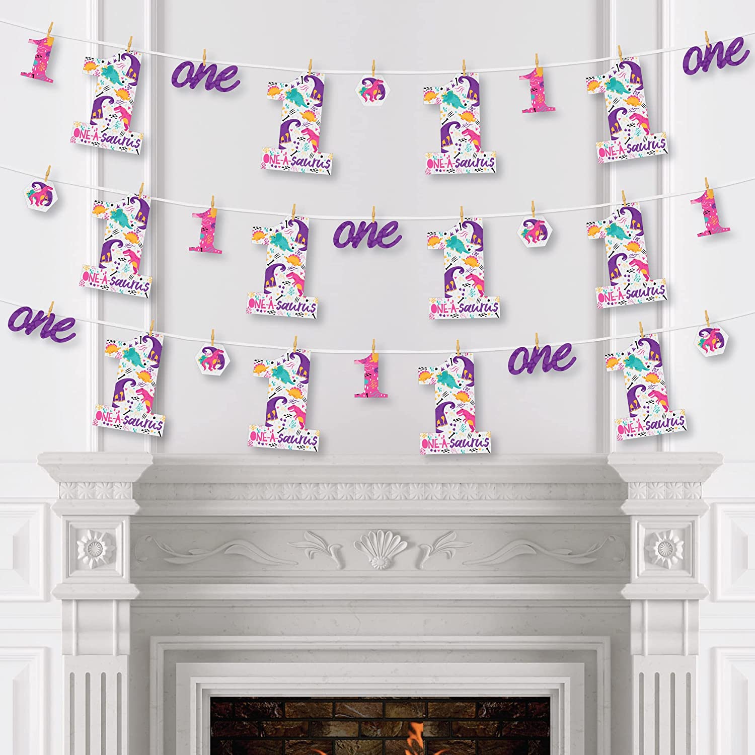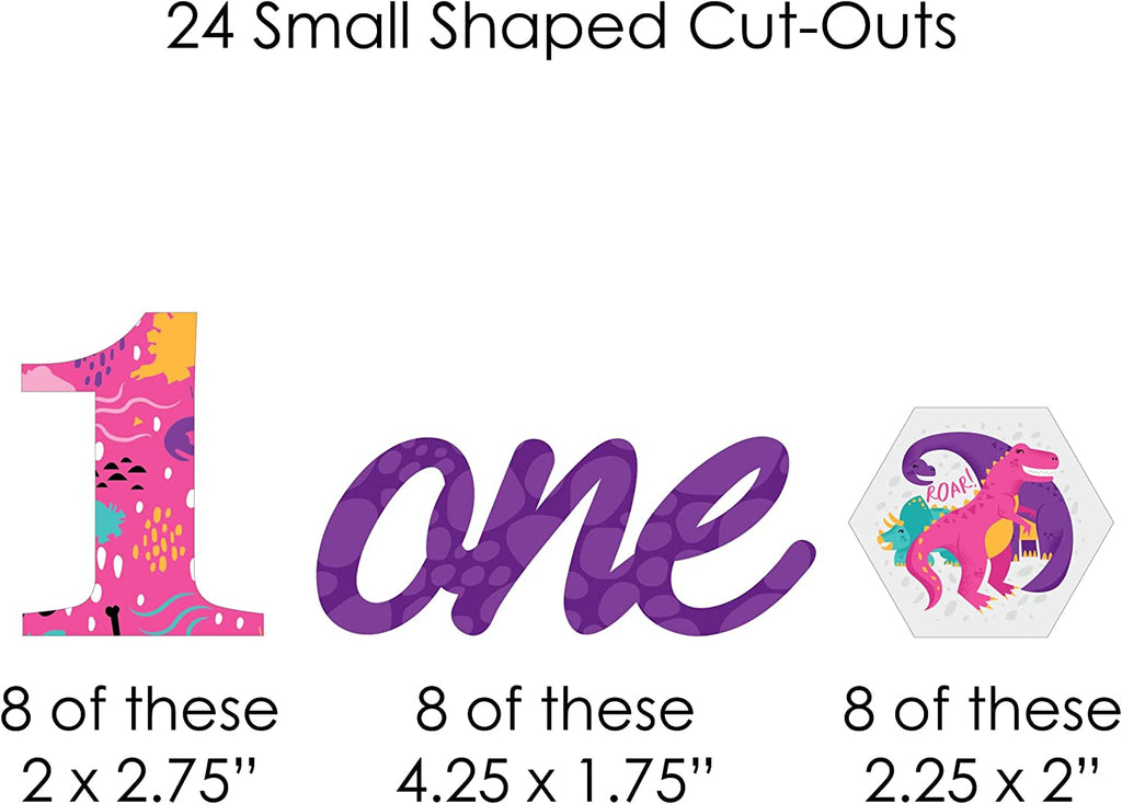 • PREMIUM PARTY DECORATION: 1st Birthday Roar Dinosaur Girl large cut-outs are professionally printed double-sided. Small cut-outs are professionally printed with coordinating pattern on back, and all on sturdy cardstock paper with a photo-like shine. They are then individually cut, inspected and carefully packaged. 1st Birthday Roar Dinosaur Girl clothespin garland banner is a 44-piece DIY kit that can be used in many ways. Get inspired with this fun do-it-yourself first birthday party decor kit!