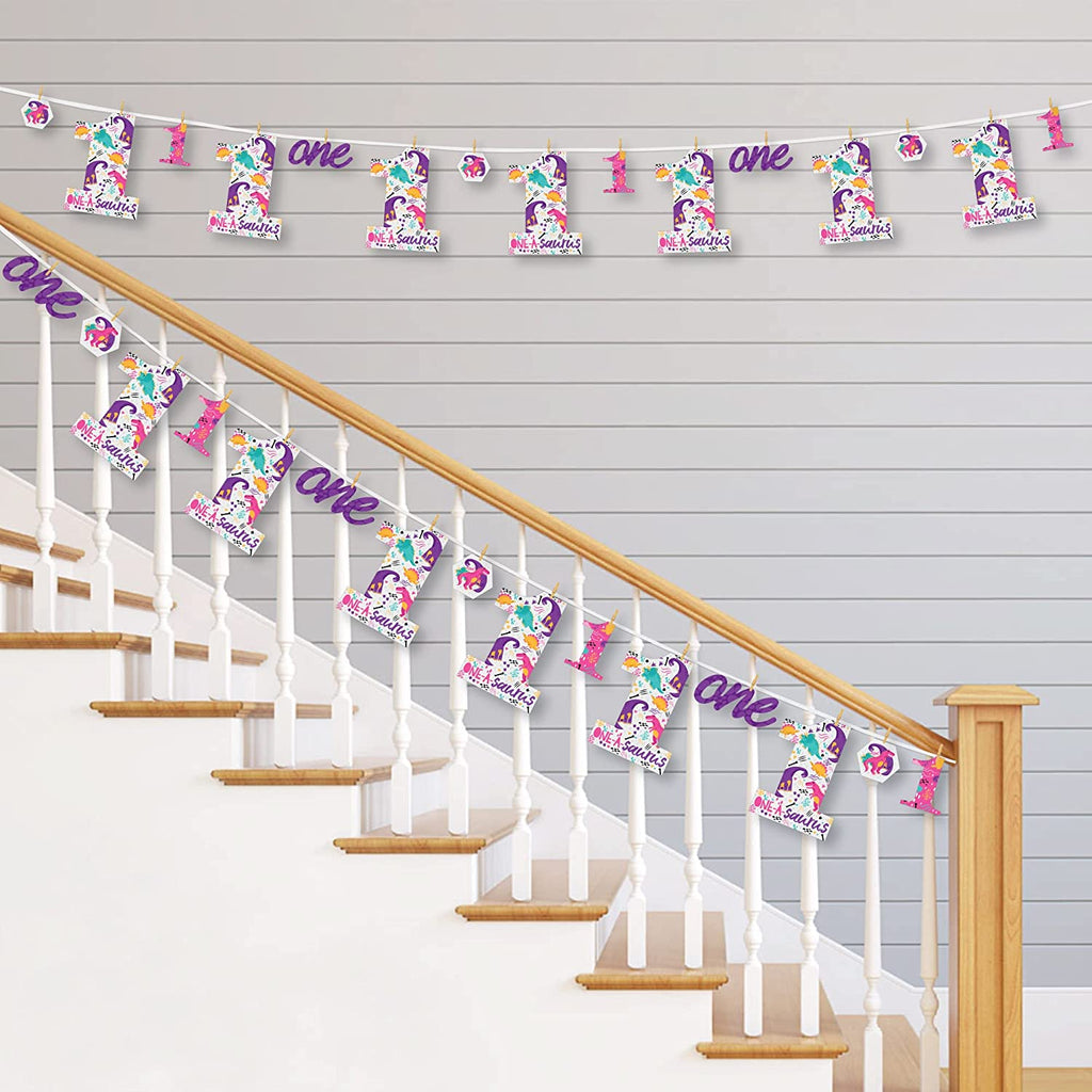 • EASY PARTY DECOR: Style any first birthday party with 1st Birthday Roar Dinosaur Girl clothespin garland banner. Before hanging, plan out your desired pattern by alternating in sizes. Using a miniature clothespin, clip shapes on the included cord. Hang finished DIY garland banner at the entrance of your party, over mantelpiece, along buffet tables, or as highchair banner decoration. After the party, reuse the clothespins and cord to hang event photos as a fun keepsake.