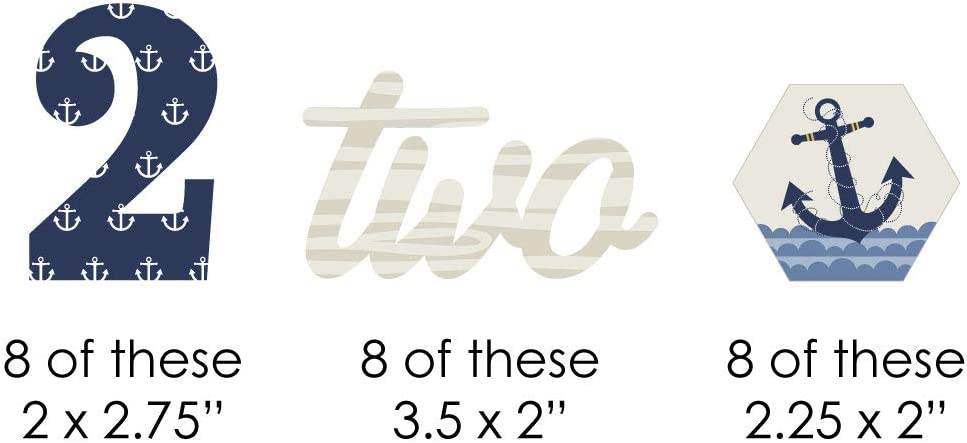 • DIY PARTY SUPPLIES: 2nd Birthday Ahoy - Nautical shaped cut outs include 24 paper die cuts in three different second birthday shapes that coordinate with the cute party theme. Set of 24 ahoy shapes SIZE 8 # two paper die cuts (2” X 2.75”); 8 two (word) paper die cuts (3.5” x 2”); 8 hexagon paper die cuts (2.25” x 2”). The unique design makes these anchor 2nd birthday party decorations a fun addition to any birthday party.