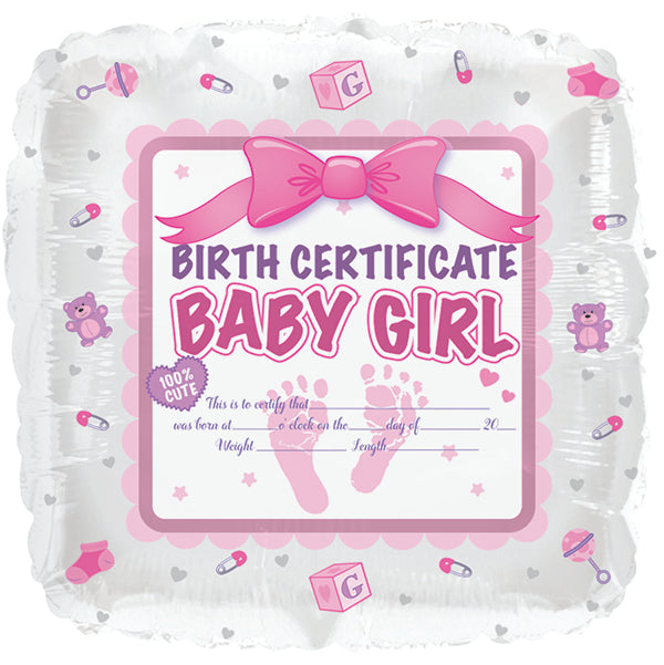 18-inches-Baby-Girl-Birth-Certificate-Foil-balloons - Without helium is backordered and will ship as soon as it is back in stock.