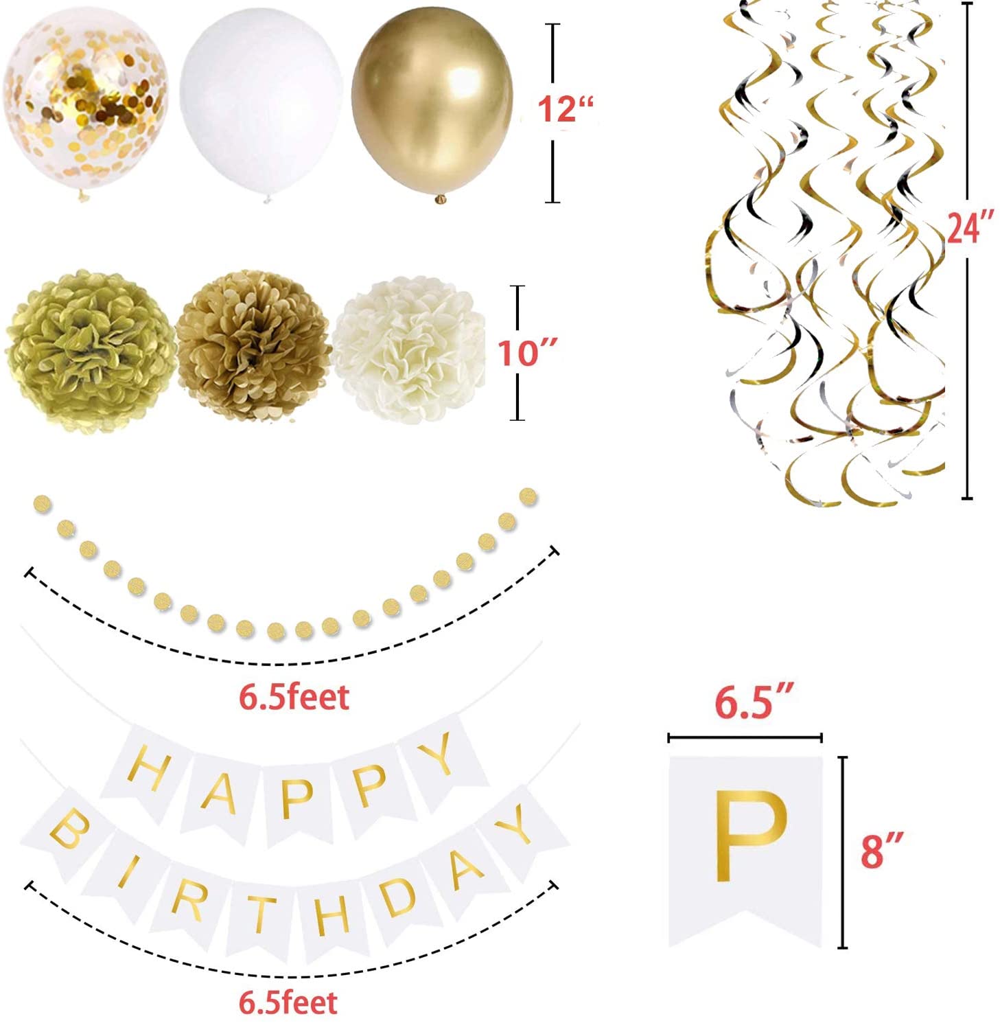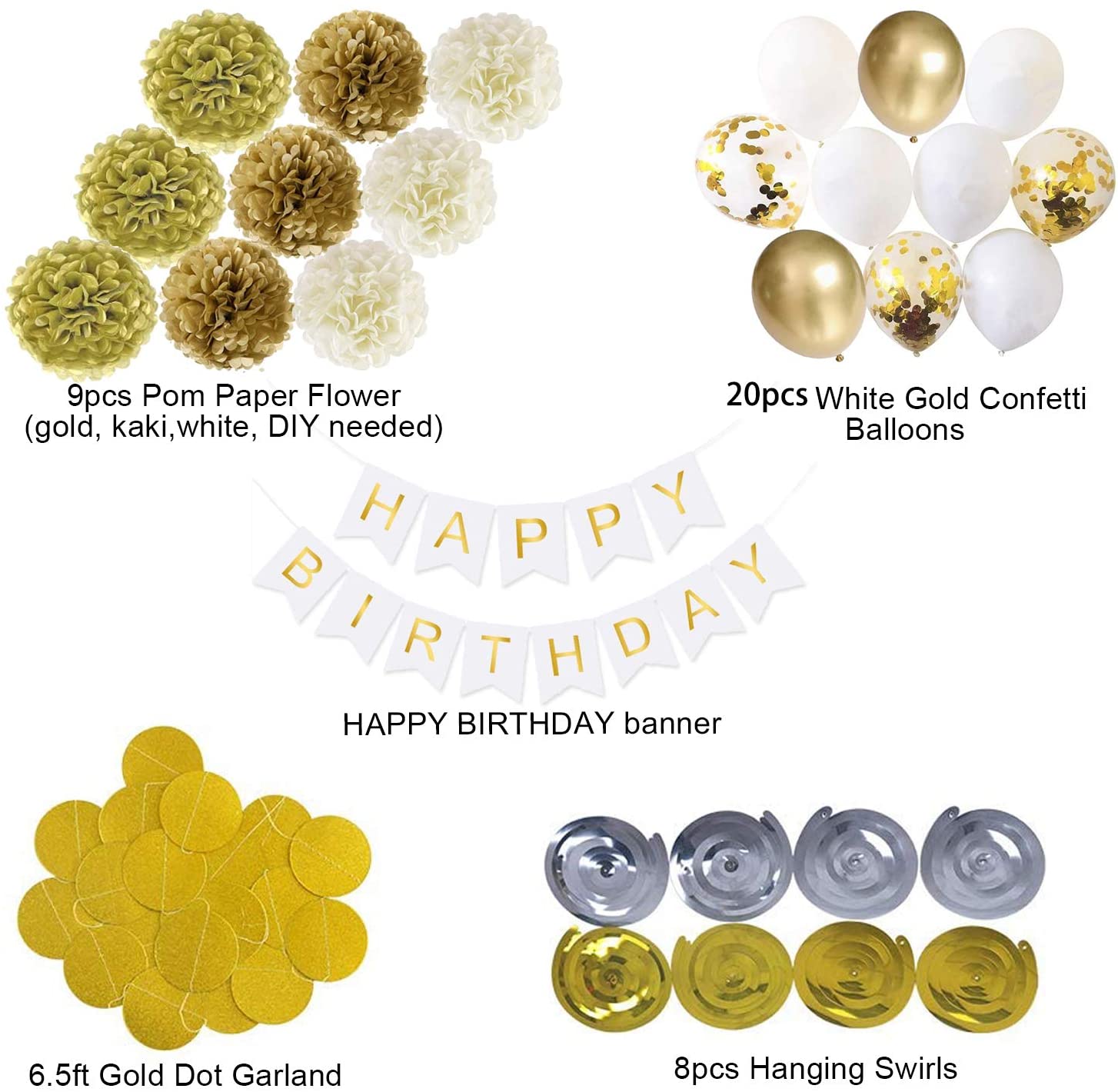 ✔️ 【Happy Birthday Decorations】5-IN-1 gold birthday party decoration set including blue happy birthday banner, 20pcs gold white confetti balloons, 9pcs white gold khaki paper pom poms, 8pcs gold hanging swirls and 6.5ft gold circle dot garland. One pack meet all you need!