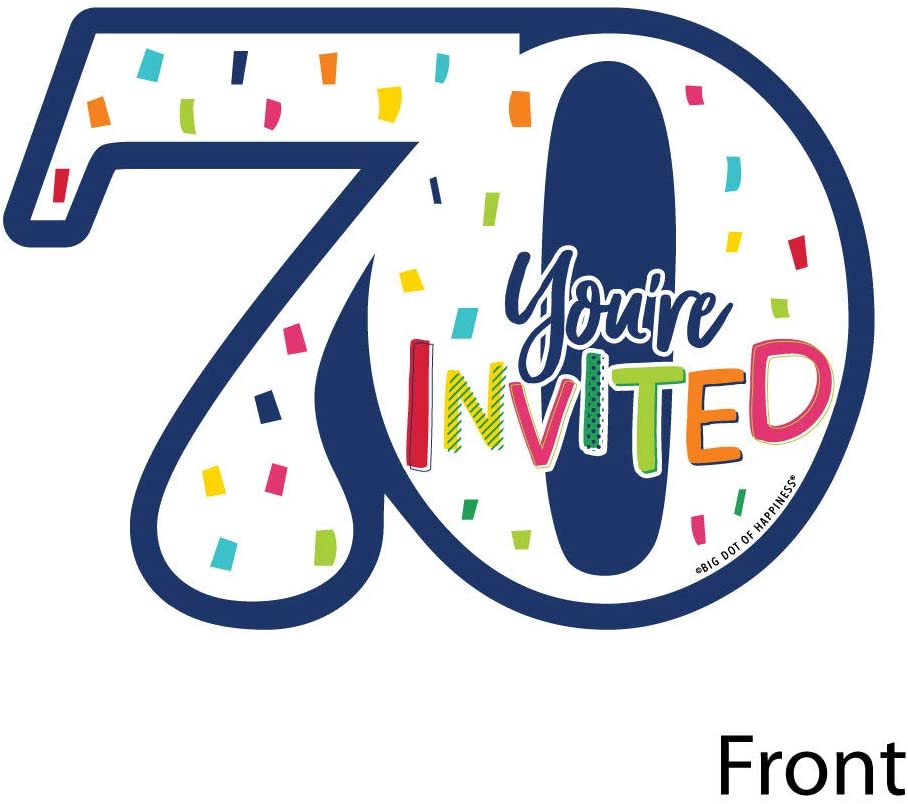 70th Birthday - Cheerful Happy Birthday - Shaped Fill-In Invitations - Colorful Seventieth Birthday Party Invitation Cards with Envelopes - Set of 12 is backordered and will ship as soon as it is back in stock.