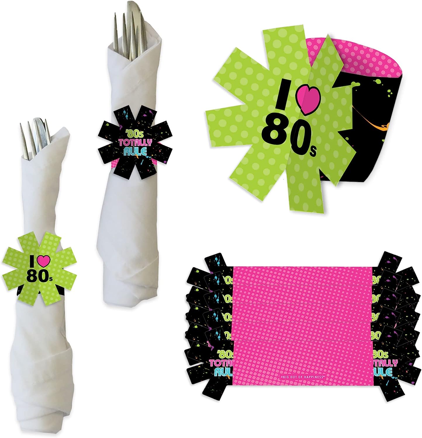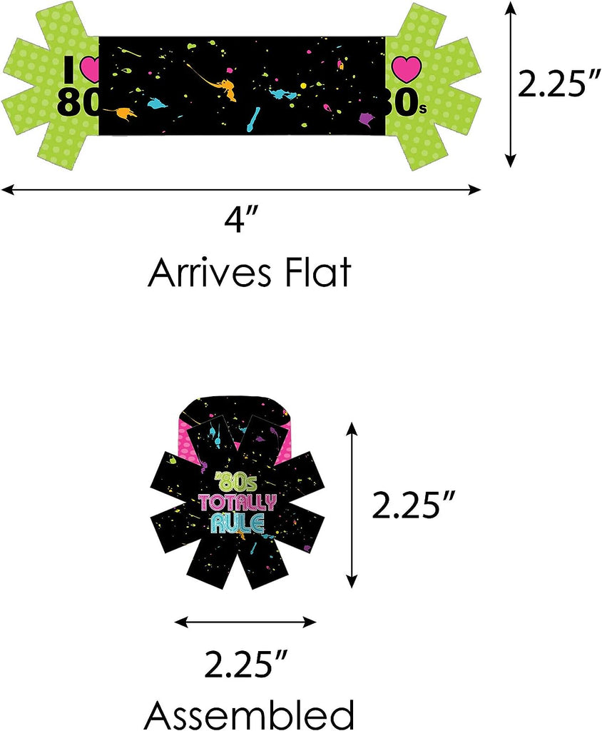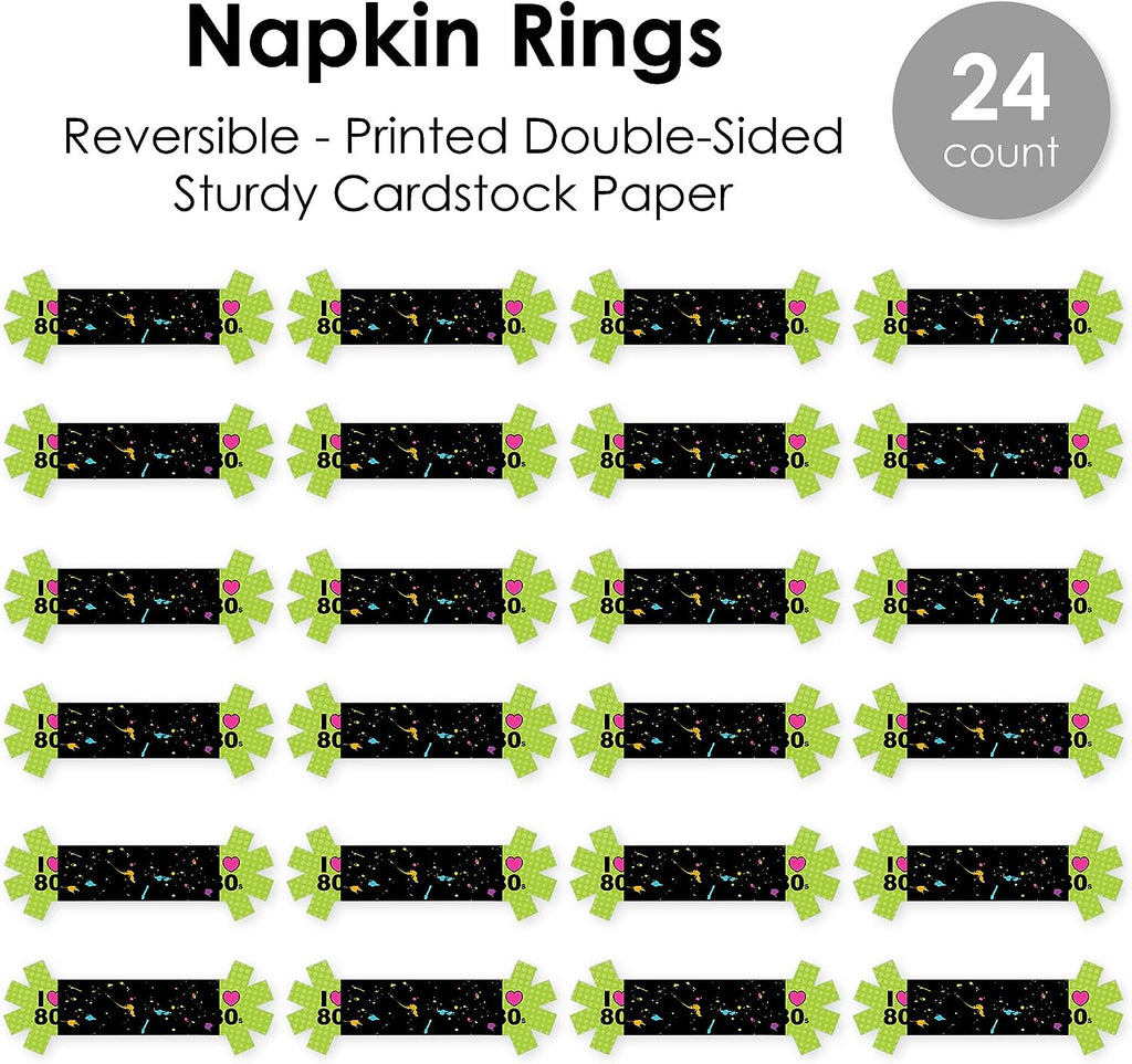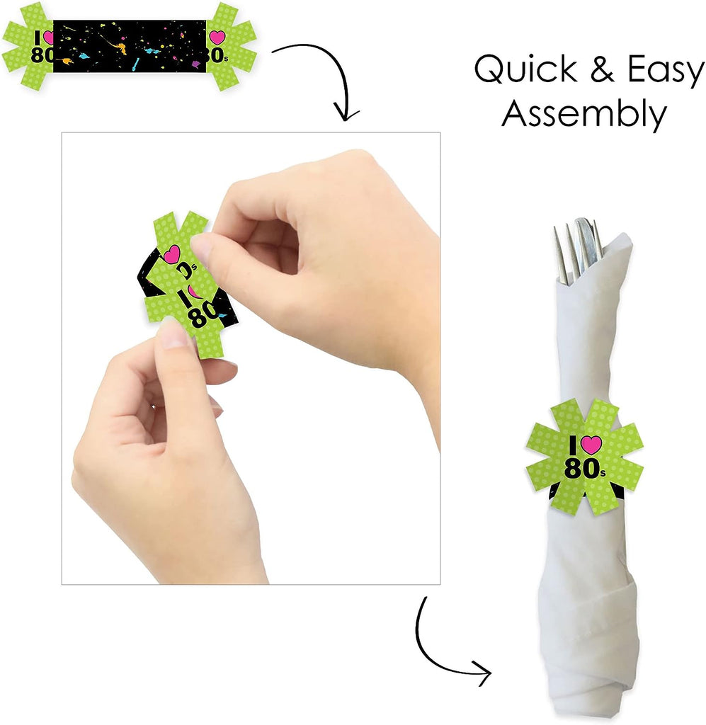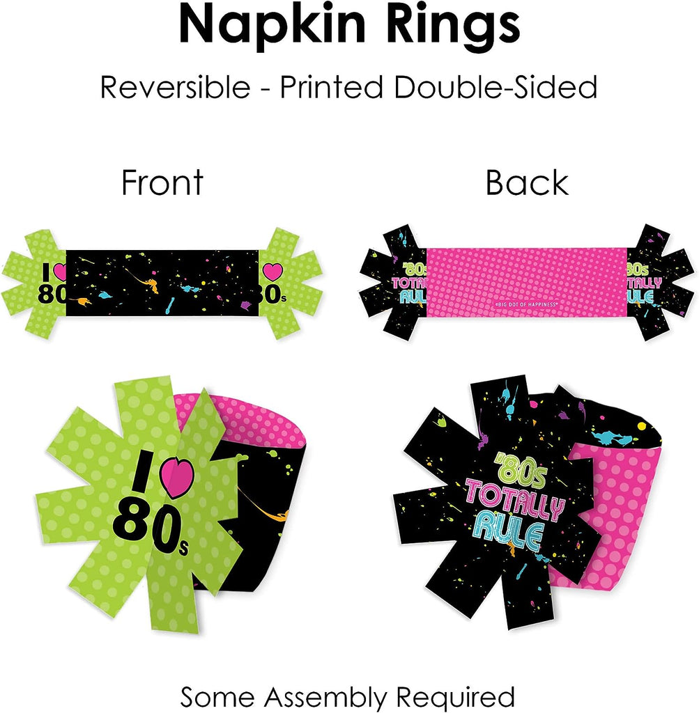 • High-Quality Supply: 80’s Retro Napkin Rings are reversible and professionally printed double-sided on sturdy cardstock paper with a photo-like shine. Each paper rings measure 2.25” wide x 2.25” tall when assembled. Napkin Rings arrive flat and will require some easy assembly.