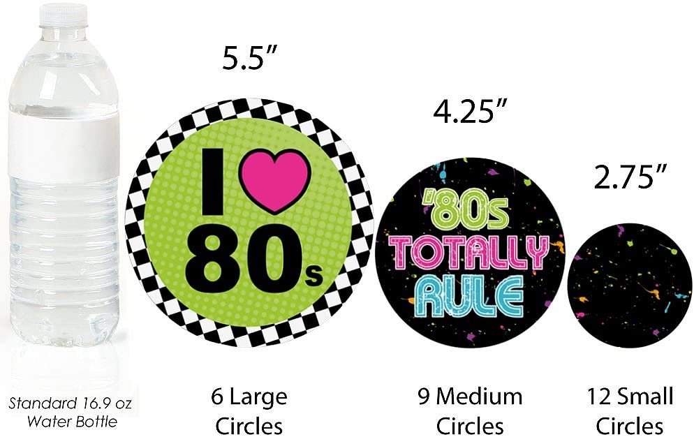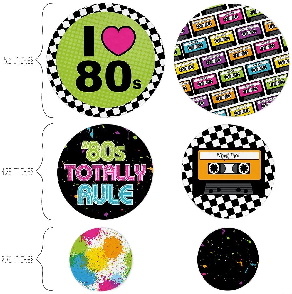 • 80's Retro giant circle confetti SIZE 5.5 inches large circles, six qty; 4.25 inches medium circles, nine qty; and 2.75 inches small circles, twelve qty. The unique design and large size makes these rock star party decorations an impressive addition to any birthday, prom or homecoming party.