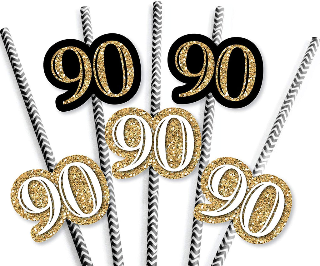 • EASY PARTY DECORATIONS: Adult 90th Birthday - Gold straw dĂ©cor will add a touch of style to your birthday party tables. Black and gold straw dĂ©cor will also look great at your beverage bar. Use these adorable ninetieth birthday party accessories as straws or swizzle sticks. The paper straws can also be cut in half and used as cupcake picks once the shaped cut out is attached.