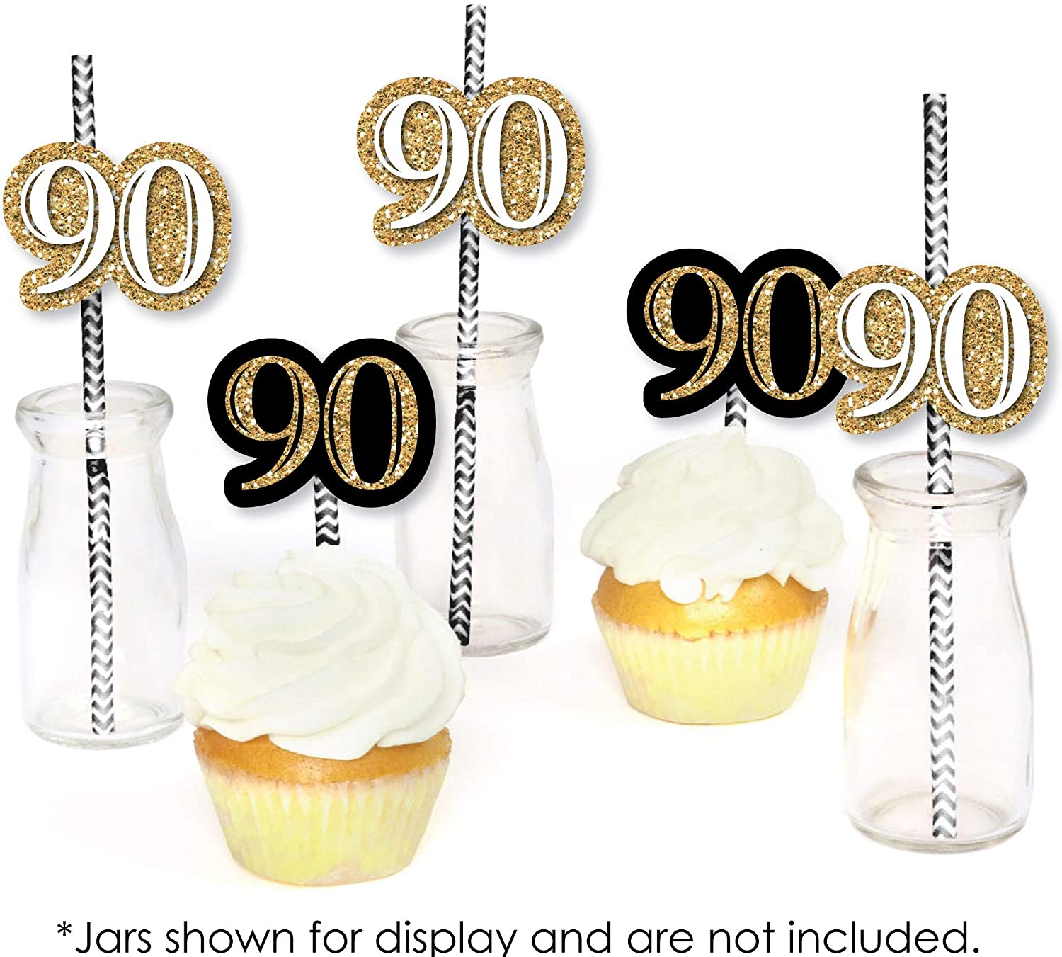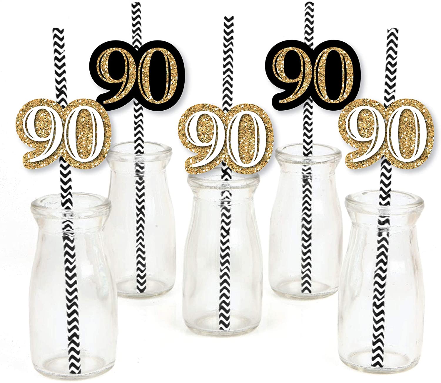 • Please Note: Mason Jars shown for display purposes and are not included. Adult 90th Birthday - Gold - Paper Straw Decor - Birthday Party Striped Decorative Straws use a No-Mess Glitter Print: Our straw dĂ©cors are designed with a printed image of glitter, eliminating glitter flake while maximizing bling effect!