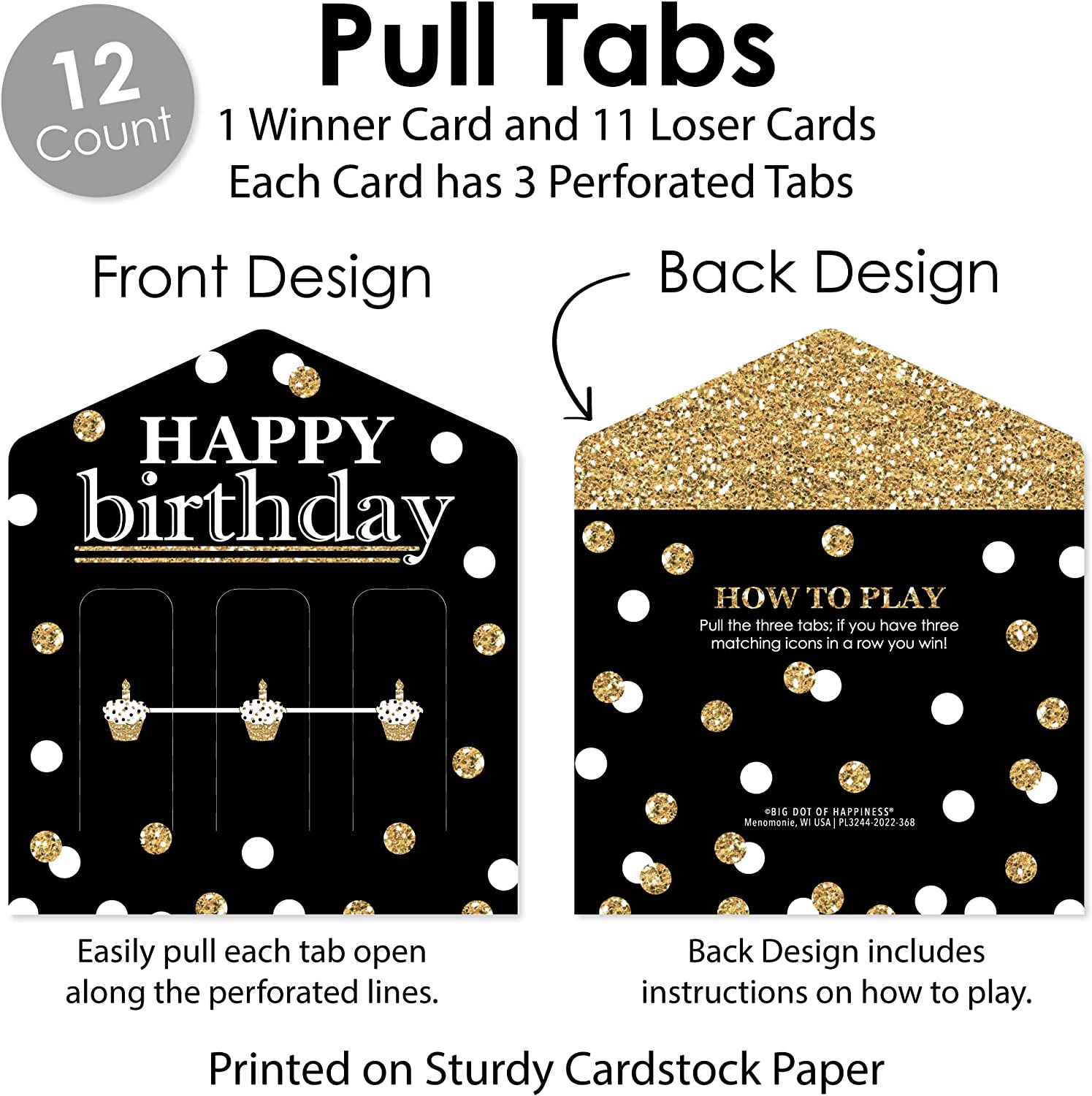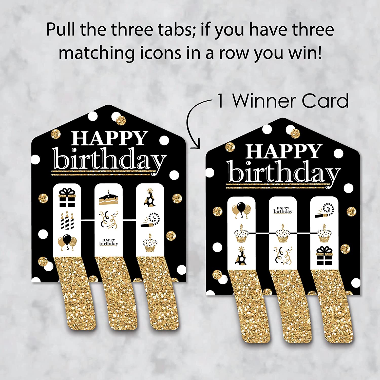 Adult Happy Birthday - Gold - Birthday Party Game Pickle Cards - Pull Tabs 3-in-a-Row - Set of 12 is backordered and will ship as soon as it is back in stock.