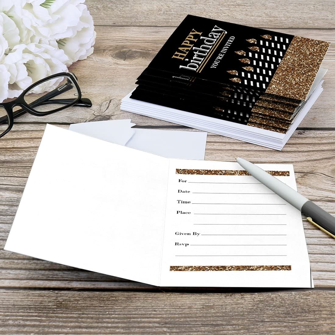 PREMIUM PARTY INVITATIONS: Adult Happy birthday party invitations are professionally printed on heavy-duty cardstock paper with a photo-like shine. They are then hand-folded and individually inspected, then carefully packaged with our exclusive squiggle flap envelopes, making this birthday stationary set a must-have for a birthday party.