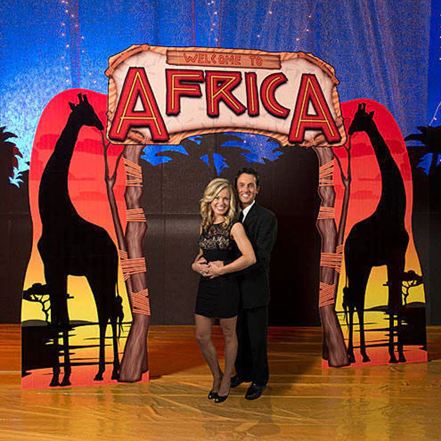 Our Africa Arch has an African feel with two silhouettes of giraffes in the sunset with a personalized topper. Each Africa Personalized Arch measures 8 feet high and is printed on one side of foam board. Give your party an African feel with this Africa Arch. Assembly required.