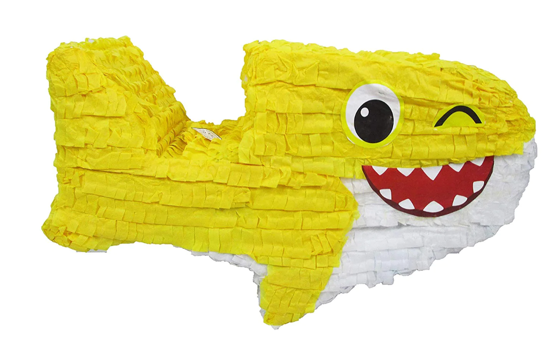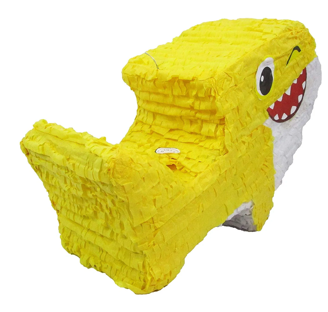 Cute yellow shark is dressed in the traditional pinata fringe-cut tissue paper and features a friendly face made of print cutouts. Pinata measures 18 inch long by 10 inch tall by 7 inch deep. Use as a table centerpiece to decorate for kids' birthdays or baby...