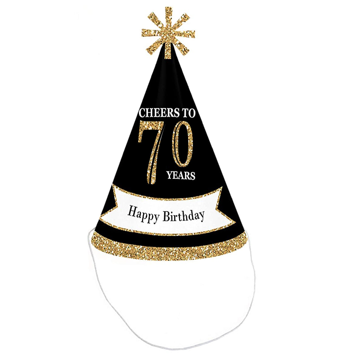 • Adult 70th birthday party hats SIZE 8.5 inches tall and 5.5 inches in diameter at the base. The included elastic chin straps measure 12 inches long. Each of these fun gold and black party hats feature a unique star cut-out decoration at the top and printed "Happy Birthday" on the front