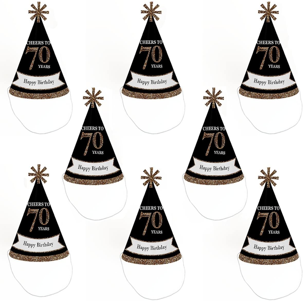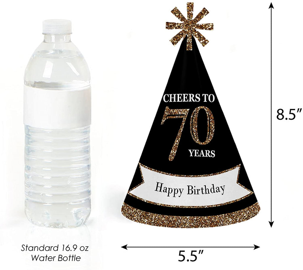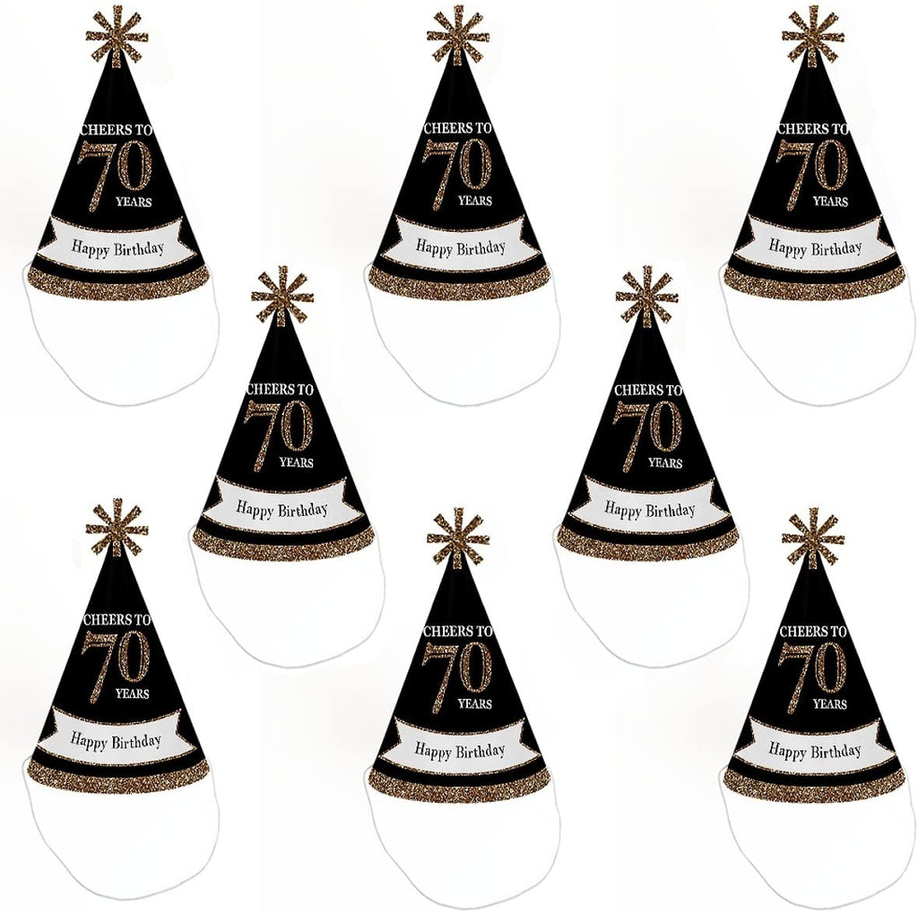 • Adult 70th Birthday Party Hats INCLUDES 8 cone-shaped gold and black 70th Birthday party hats for adults with decorative top and elastic chin straps. Adult 70th Birthday party hats are a larger size but will fit both children and adults. Some easy and quick assembly required.