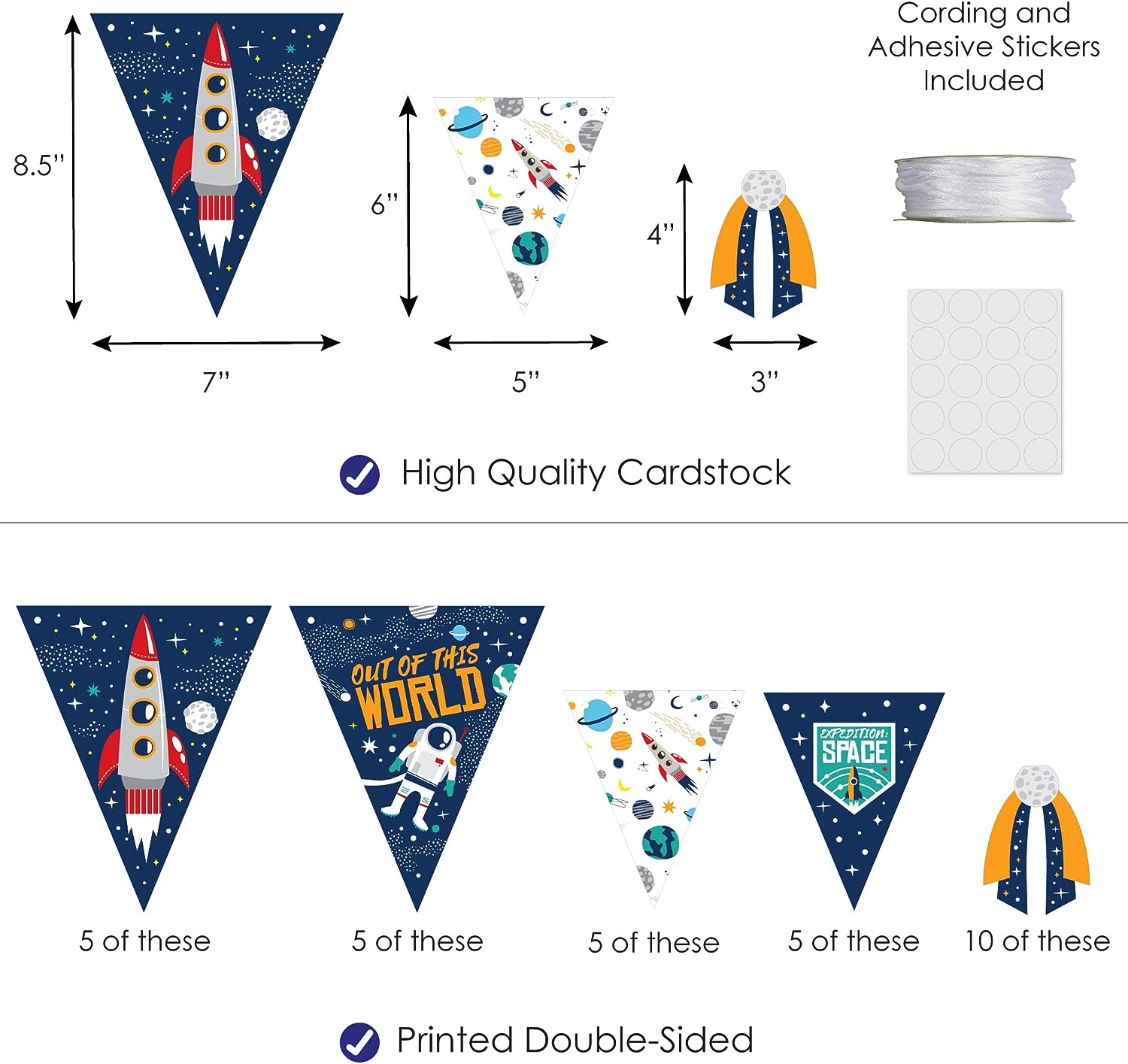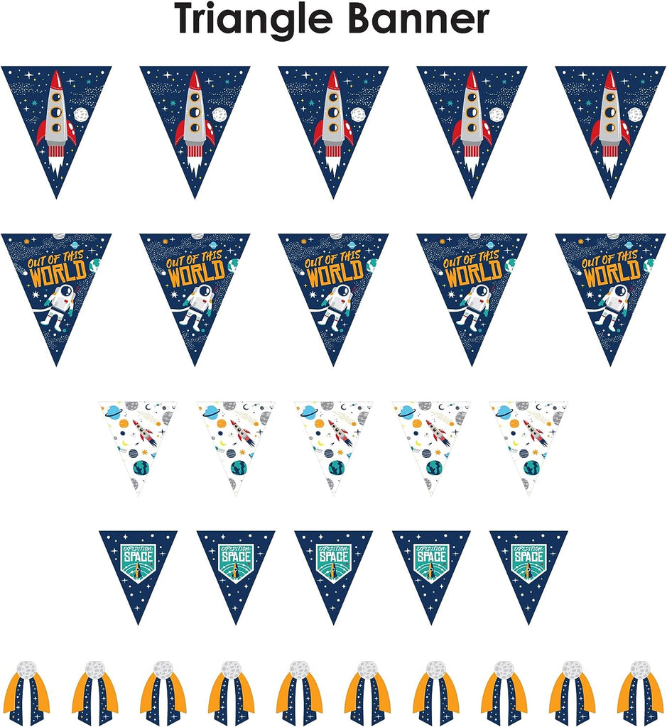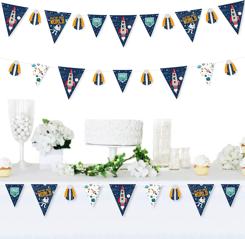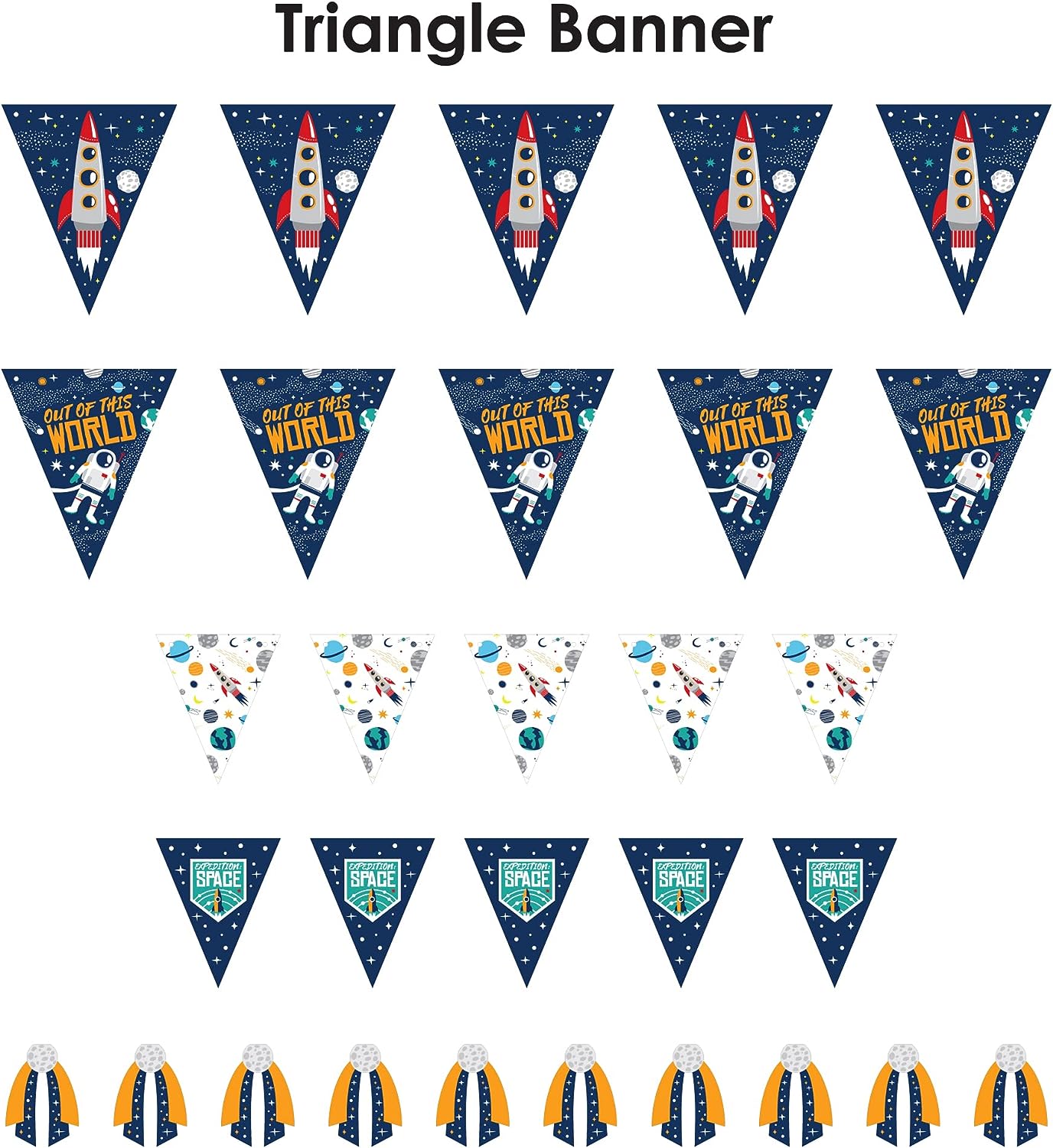 Blast Off to Outer Space - DIY Rocket Ship Baby Shower or Birthday Party Pennant Garland Decoration - Triangle Banner - 30 Pieces is backordered and will ship as soon as it is back in stock.