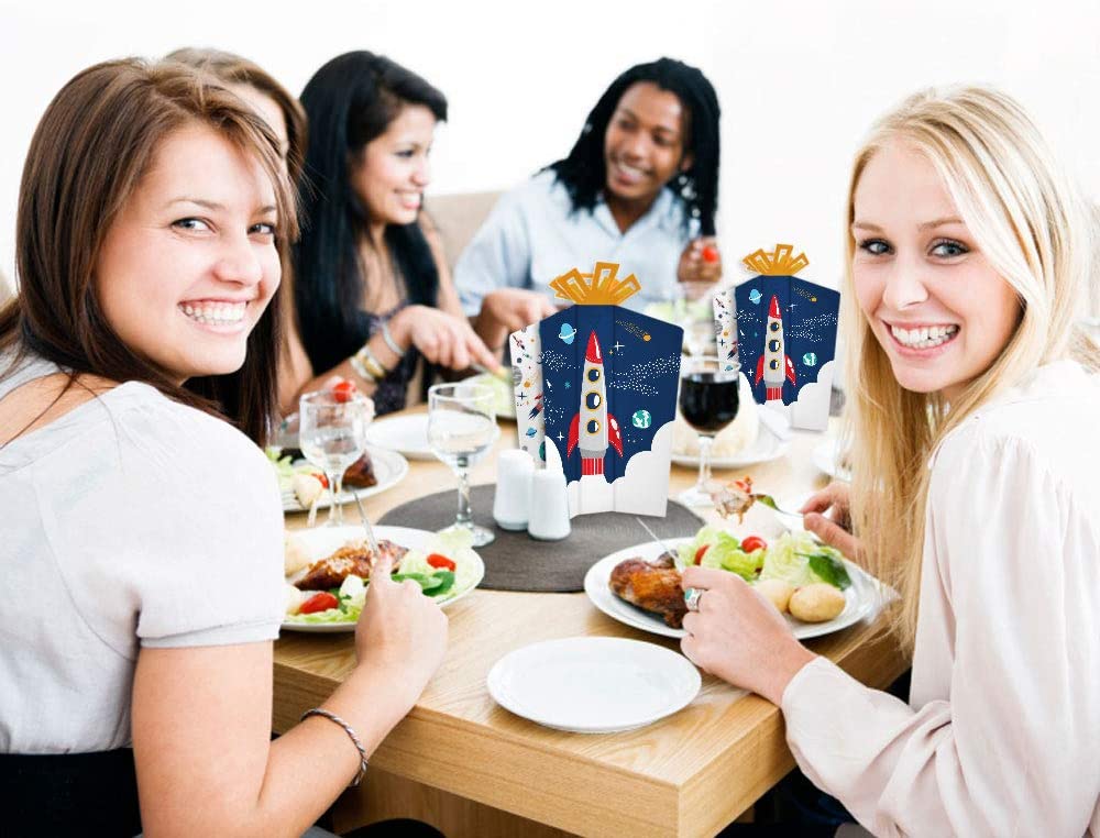 • EASY TABLE DECOR: Each Blast Off to Outer Space centerpiece SIZE 5 inches wide (front/back) x 3 inches wide (sides) x 10.5 inches tall. This 10 count table decorations set requires easy folding to flare out each centerpiece at your desired look. Easy DIY folding assembly: Use a flat surface to fold along the scored creases to stand the centerpiece upright and be able to balance on its own.