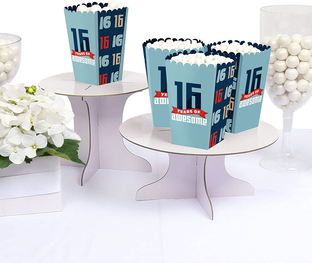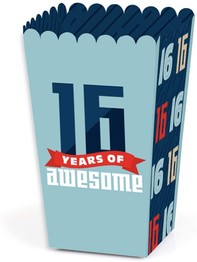 • POPCORN BOX PARTY SUPPLIES: Boy 16th Birthday popcorn boxes will hold a variety of party food. Fill them with sweet treats or salty snacks. Popcorn, caramel corn, candies and other goodies will look amazing on your candy buffet with these 16 years of awesome party favor boxes.