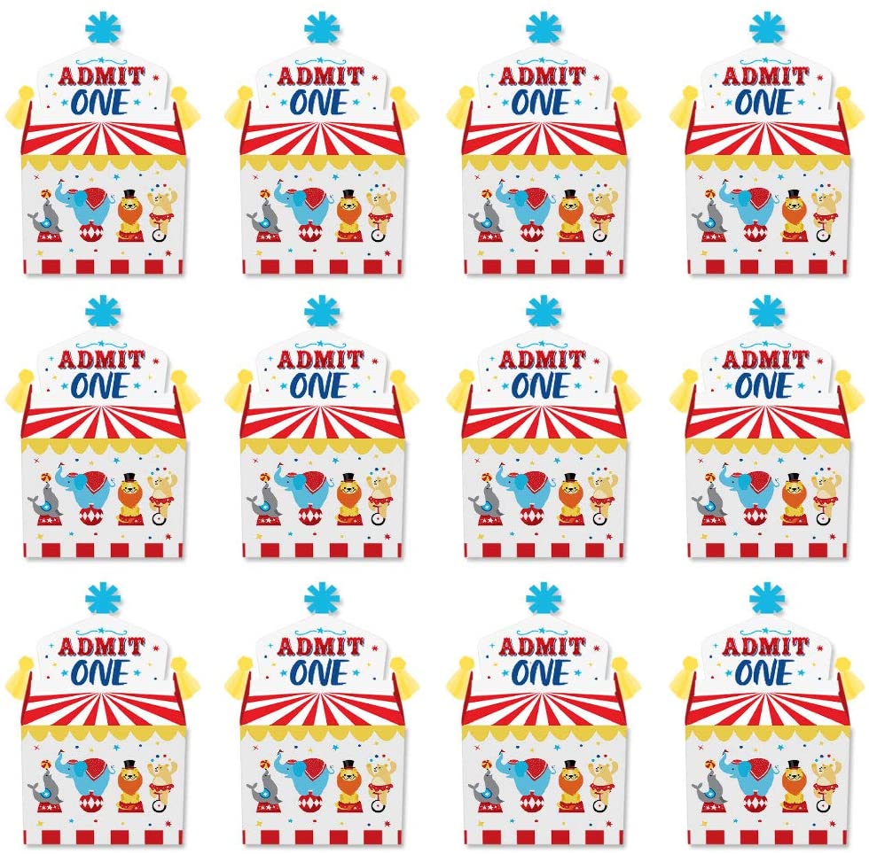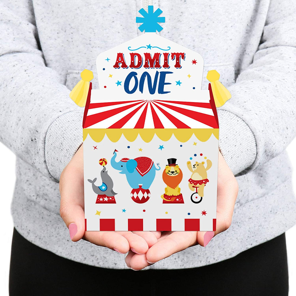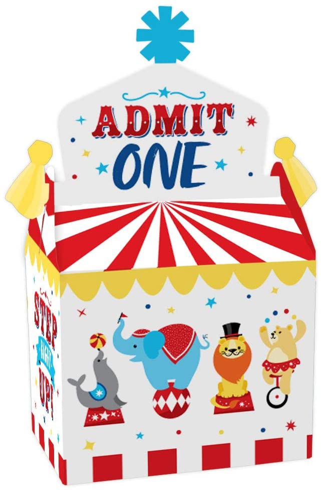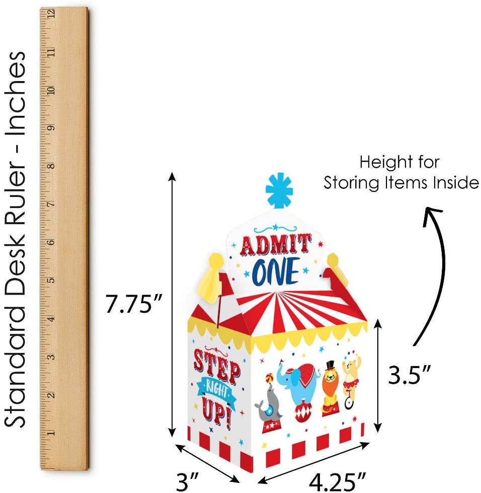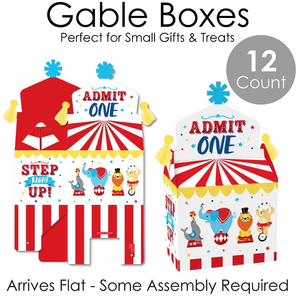 • Gable Boxes INCLUDE: 12 Carnival - Step Right Up Circus-themed goodie party favor boxes. Each box SIZE measures 4.25 inches length x 3 inches width x 7.75 inches height. Gable favor boxes are ideal for small gifts and treats that are under 3.5 inches tall (height for storing items in closed box).