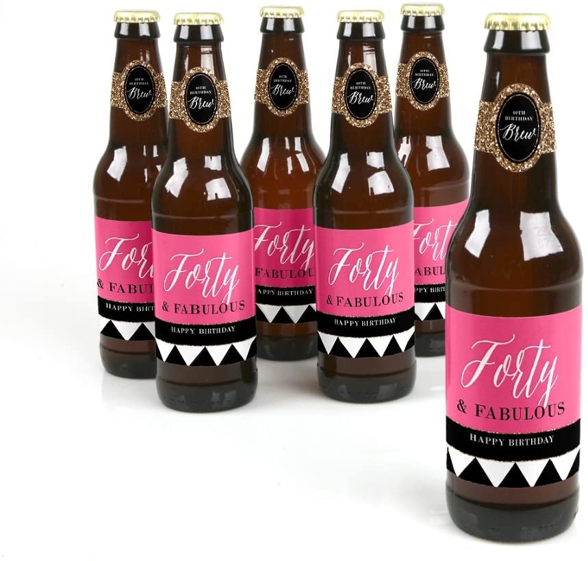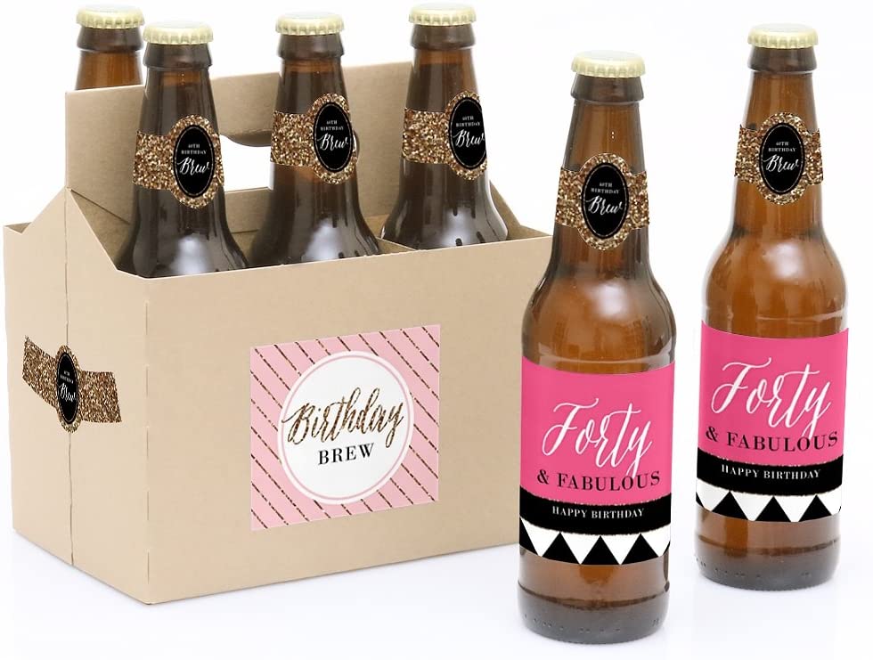• Chic 40th Birthday Beer Gift Set INCLUDES 6 beer bottle sticker labels & 6 bottle neck labels in the pink, black and gold 40th birthday theme, as well as 1 six-pack carrier with 4 Chic 40th Birthday party stickers for decoration.