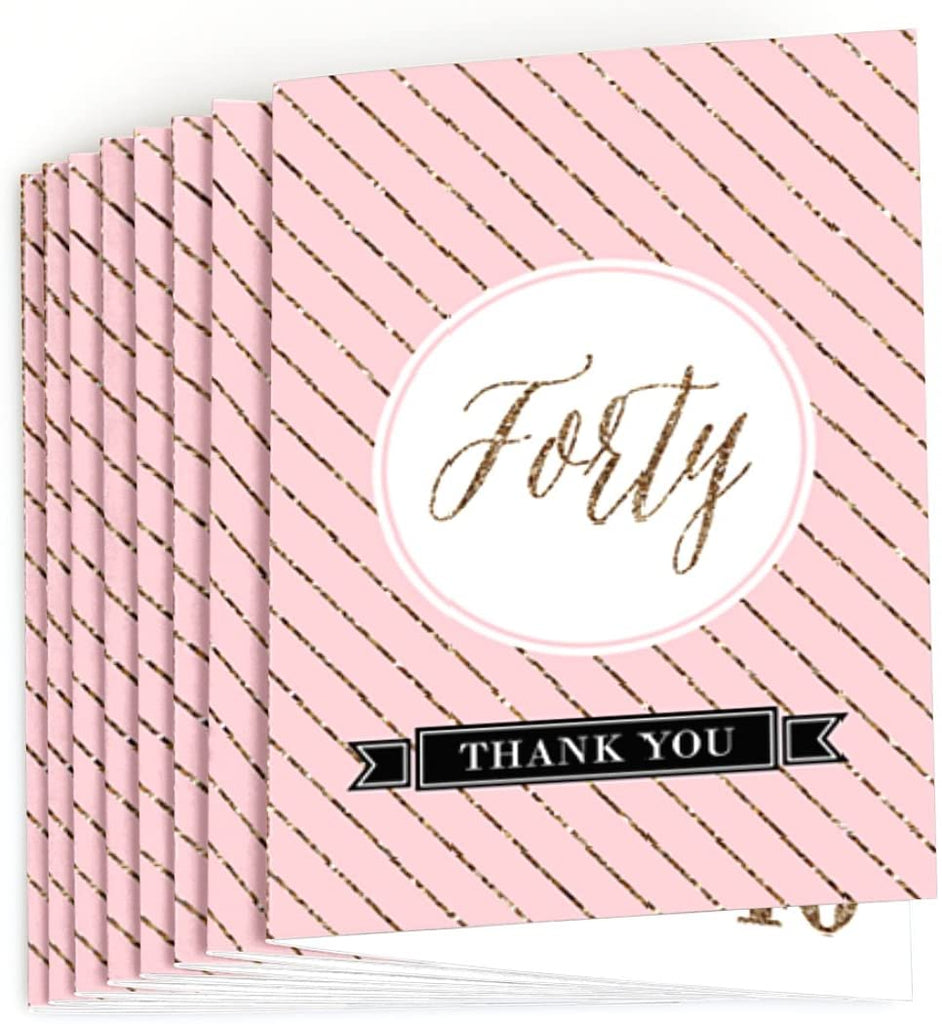 • Chic 40th BirthdayThank You Note Card Set INCLUDES 8 40th birthday party thank yous and premium white envelopes.  These pink, black and gold thank you notes are perfect for a birthday party.