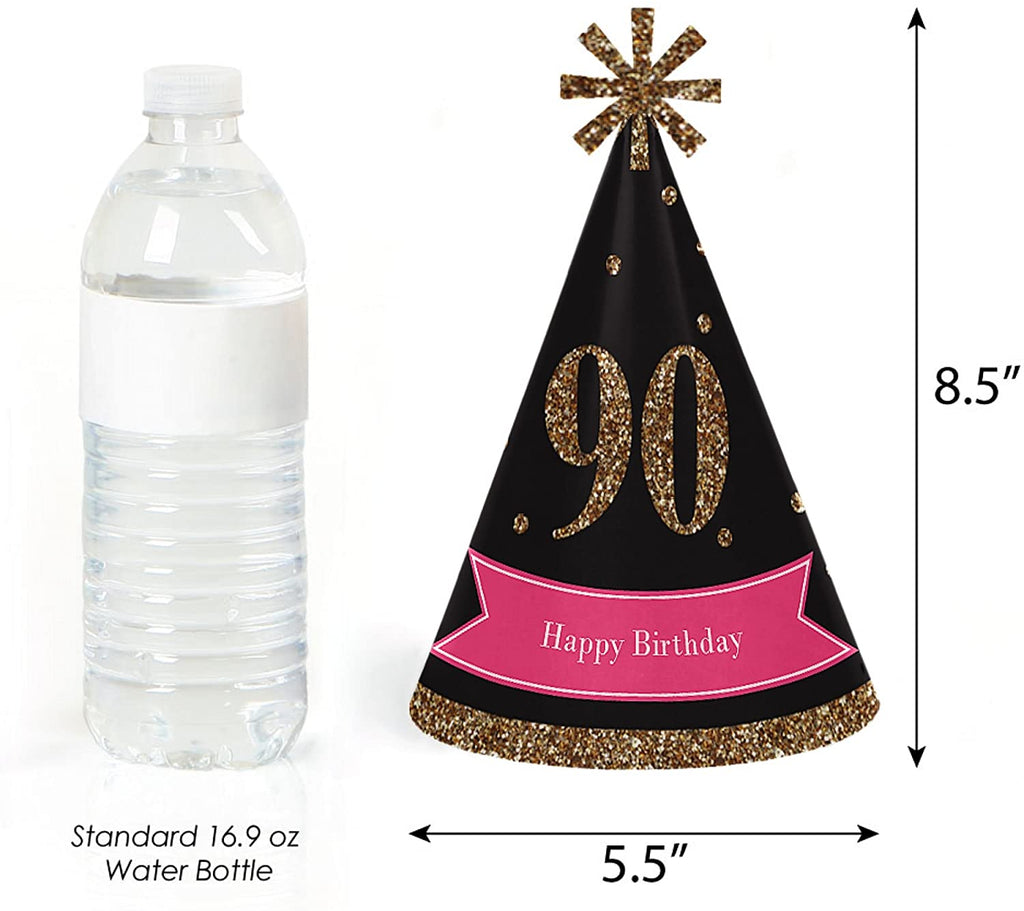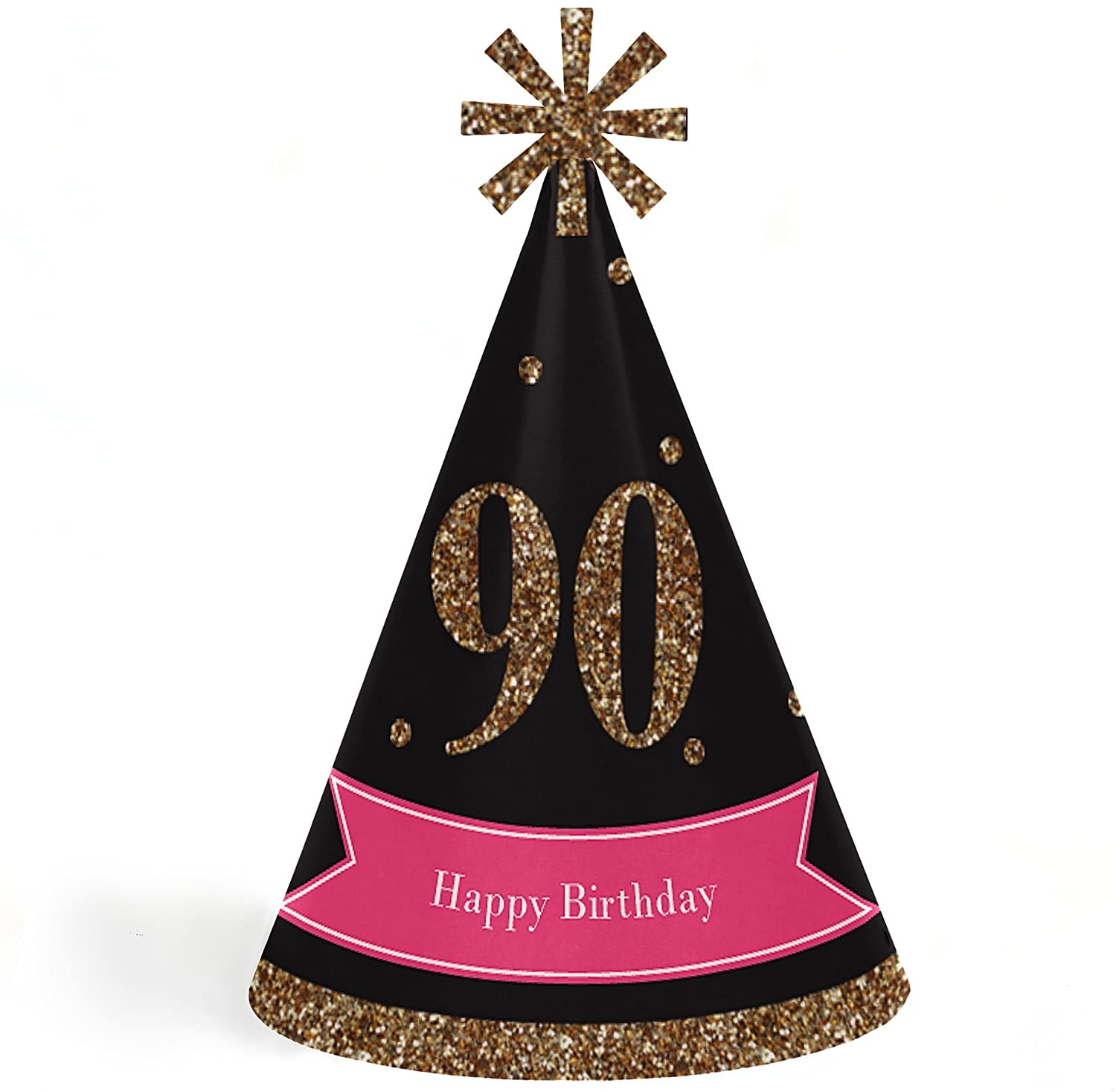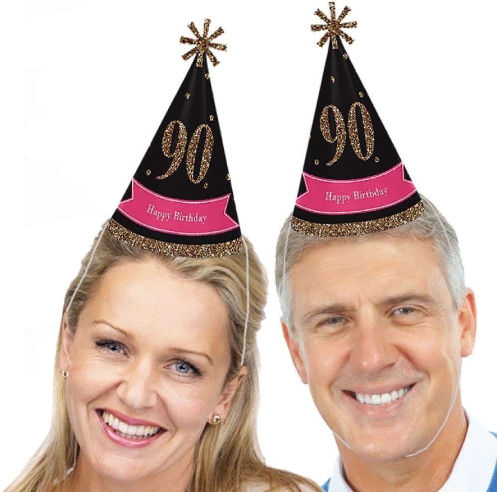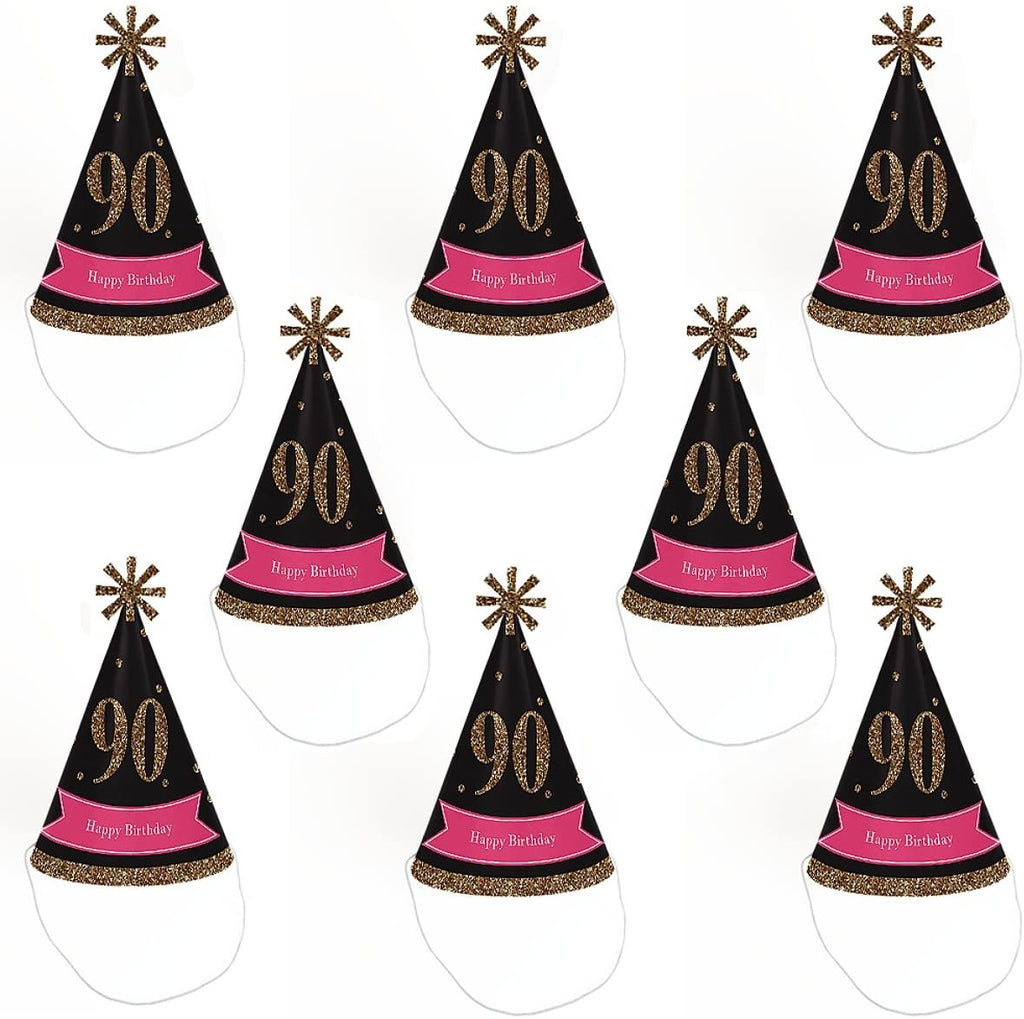 Chic 90th Birthday - Pink, Black and Gold - Cone Happy Birthday Party Hats for Kids and Adults - Set of 8 is backordered and will ship as soon as it is back in stock.