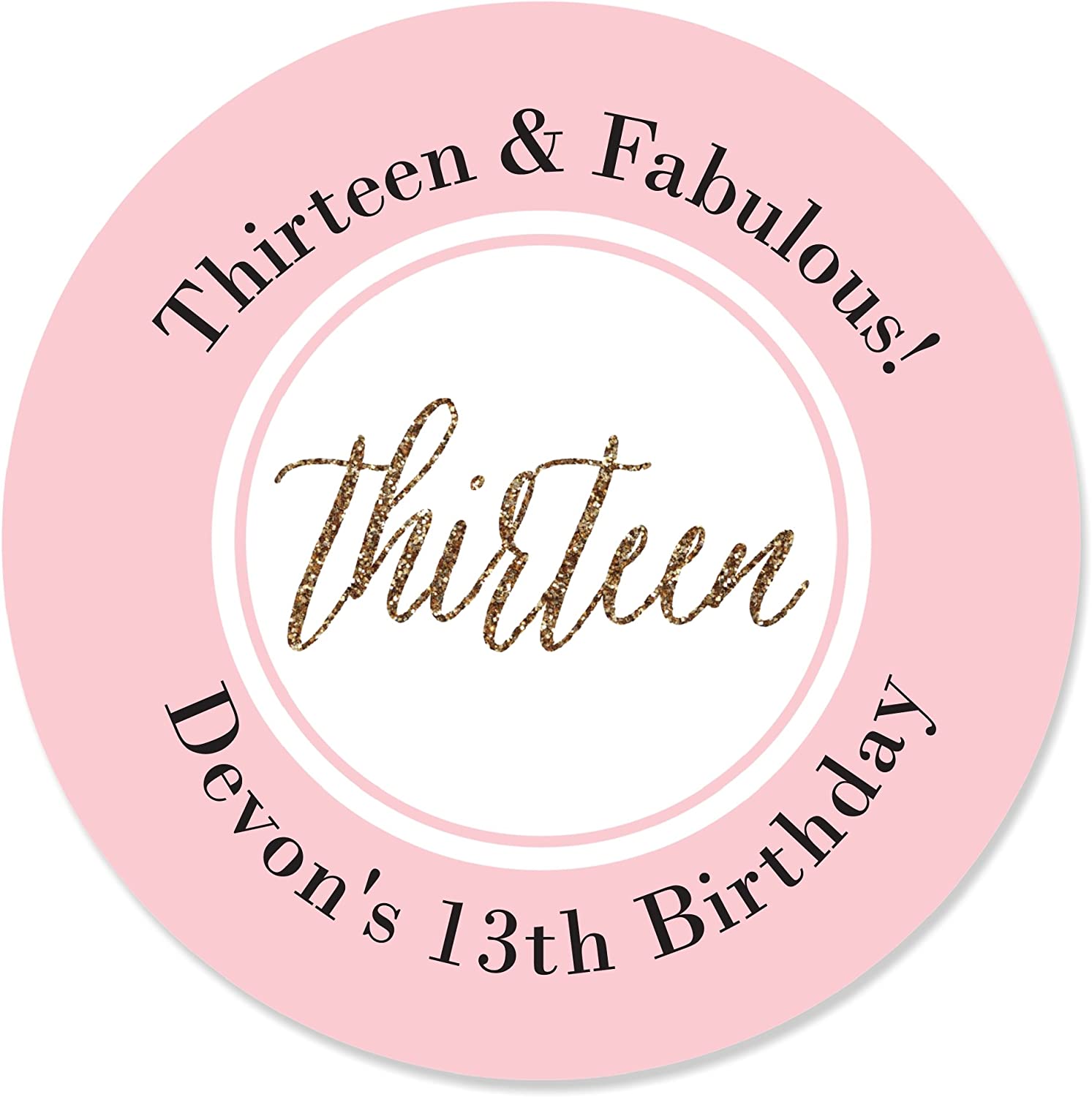 • Chic 13th Birthday round stickers MEASURE 1.75 inches diameter and will quickly add a personal touch to all your birthday party favors. Simply click "customize now" to add your personalized text to these fun pink and gold birthday circle labels.