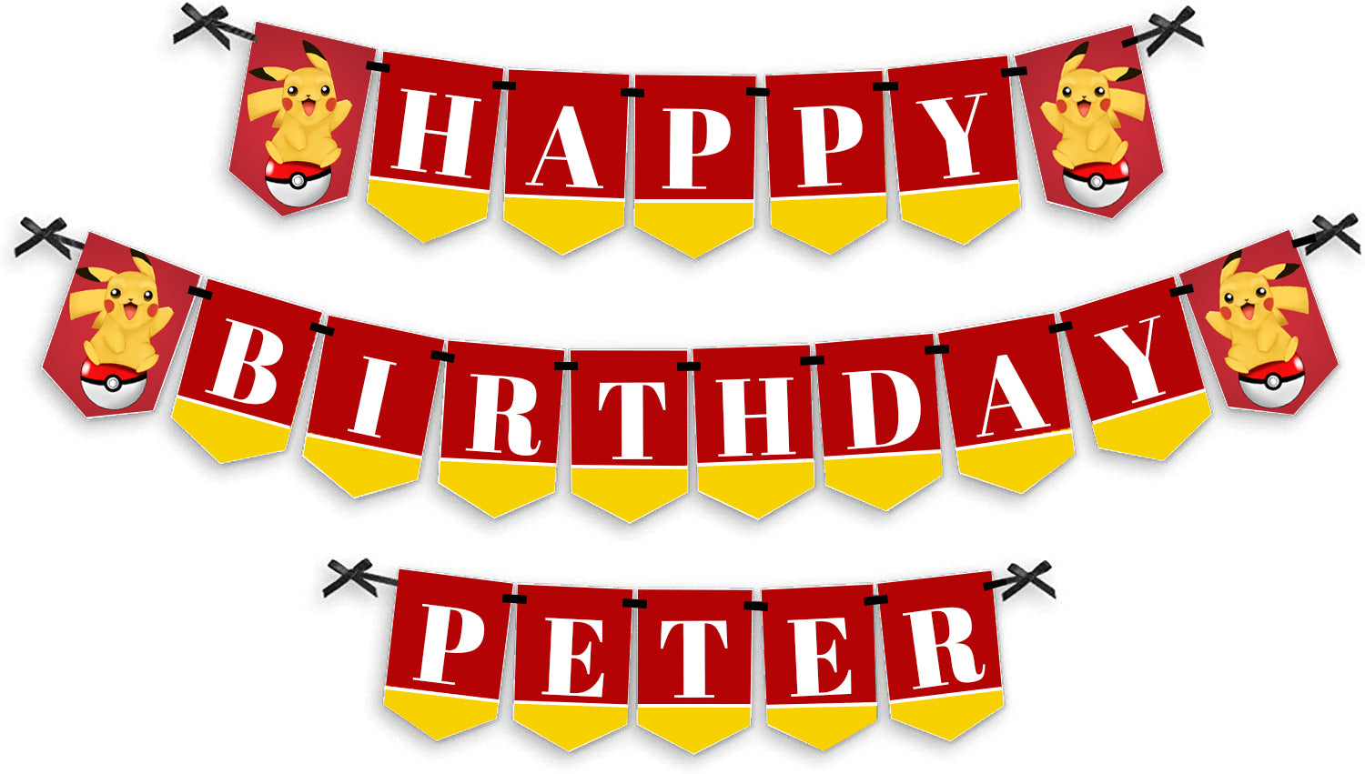 • PREMIUM BIRTHDAY PARTY SUPPLIES: Custom  Pokemon Bunting Banner is professionally printed on sturdy cardstock paper. Each pennant is individually inspected then carefully packaged by hand. Personalized bunting banners require some easy assembly. Following the number sequence on the back of each pennant, simply string the included satin ribbon through the pennant slots. Create multiple rows by cutting the ribbon to your desired length or hang as one long banner.