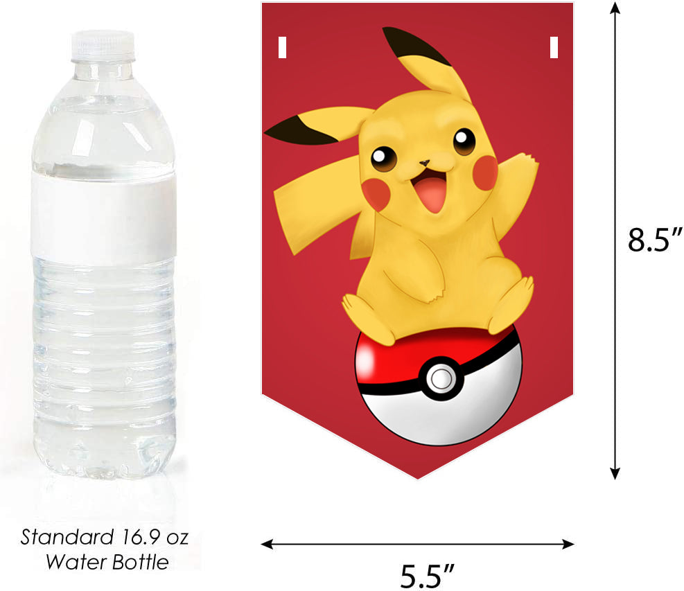 • Pokemon Personalized Bunting Banners SIZE: Each pennant measures 8.5 inches high x 5.5 inches wide. Ribbon measures 24 feet long and 3/8 inch wide. PERSONALIZED PARTY SUPPLIES: Pokemon banners feature your custom text.