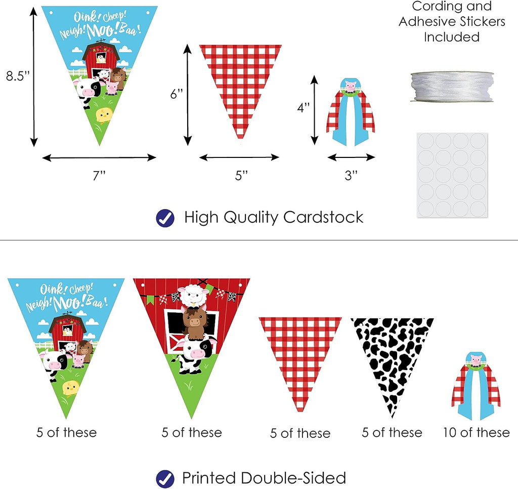 • High-Quality Supply: Farm Animals flags and paper tassels are professionally printed double-sided on heavy-duty cardstock paper with a photo-like shine. Large pennants measure 7 inches wide by 8.5 inches tall, small pennants measure 5 inches wide by 6 inches tall, and paper tassels measure 3 inches wide by 4 inches tall.