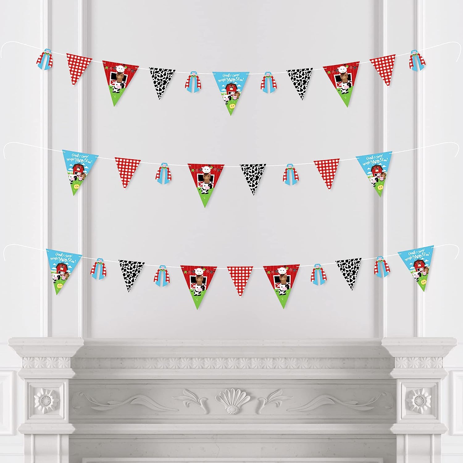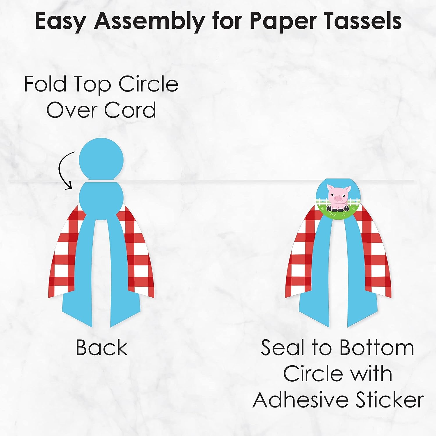 • DIY Assembly: Farm Animals banner is easy to put together. Simply string the cording through the punched holes on each pennant piece and add the paper tassels using the included adhesive dots. Secure the triangle banner by tying the ends into a knot and hang the banner using an included clear circle sticker. Instructions included on packaging.