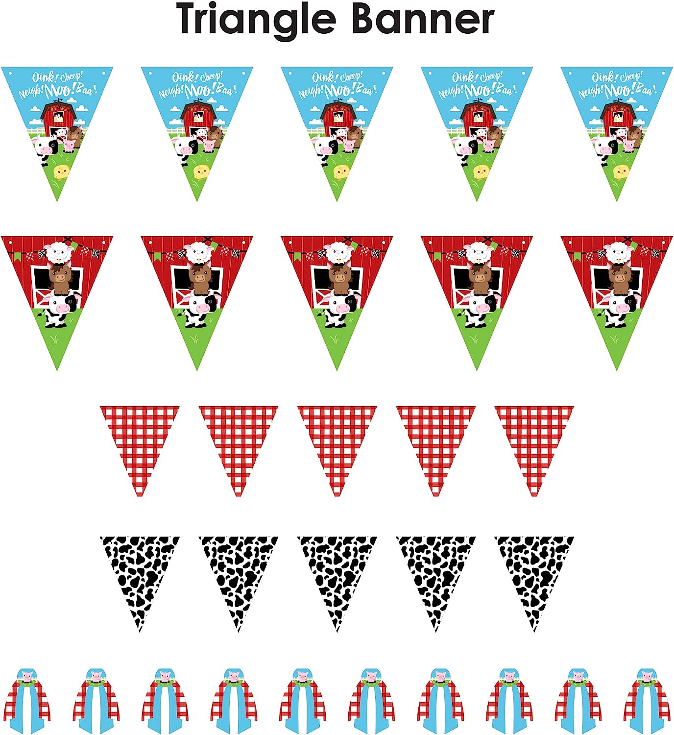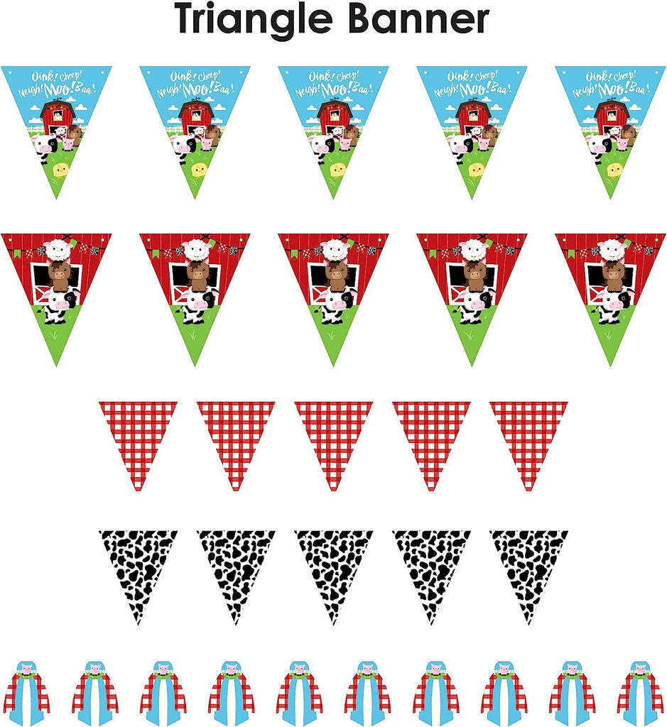• Farm Animals Triangle Banner includes a set of 20 paper triangle flags, 10 paper tassel shapes, satin cording, and adhesive stickers. Make a fun garland banner that will look amazing at your baby shower or birthday party.