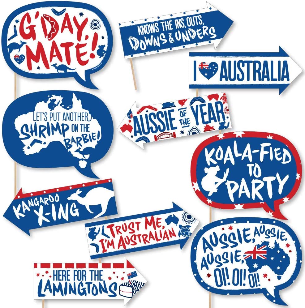 • 10-Piece Funny Australia Day Photo Booth Props Kit INCLUDES 10 Aussie arrow and speech bubble photo booth props, 10 wooden dowel sticks and stickers for assembly. EASY ASSEMBLY: Simply attach the printed DIY photo booth props to the wooden dowels with included reinforcing stickers.