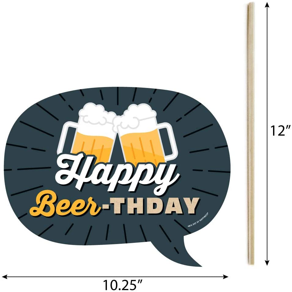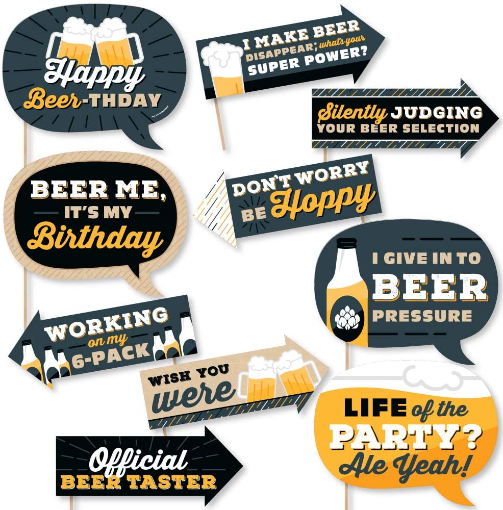 • 10-Piece Funny Cheers and Beers Happy Birthday Photo Booth Props Kit INCLUDES 10 beer arrow and speech bubble photo booth props, 10 wooden dowel sticks and stickers for assembly. EASY ASSEMBLY: Simply attach the printed DIY photo booth props to the wooden dowels with included reinforcing stickers.