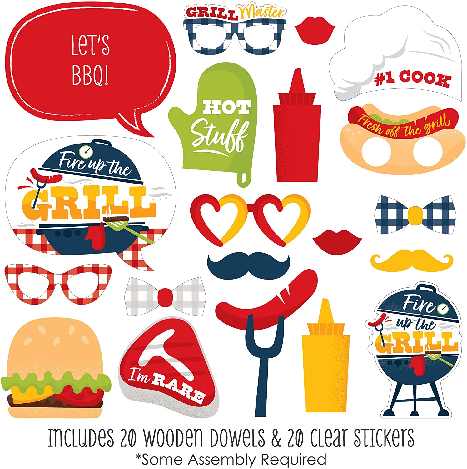 • 20-Piece Summer BBQ Picnic Photo Booth Props Kit INCLUDES 20 Fire Up the Grill photo booth props, 20 wooden dowel sticks and stickers for assembly. EASY ASSEMBLY: Simply attach the printed DIY photo booth props to the wooden dowels with included reinforcing stickers.