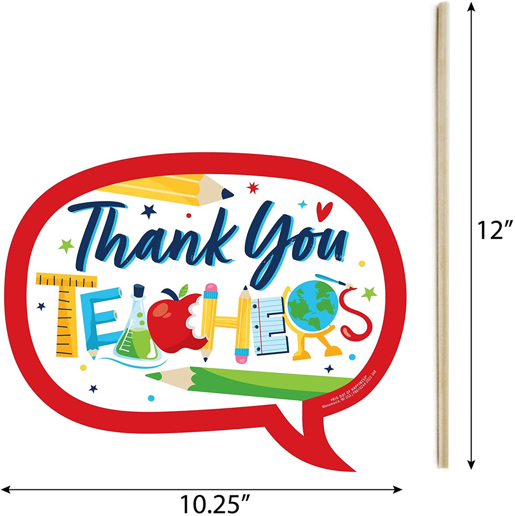 • HIGH-QUALITY: Thank You Teachers photo booth props are professionally printed on thick cardstock paper. They will arrive cut out and ready to assemble with the included wooden dowel sticks and stickers.