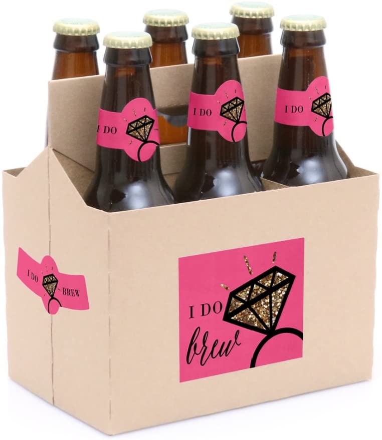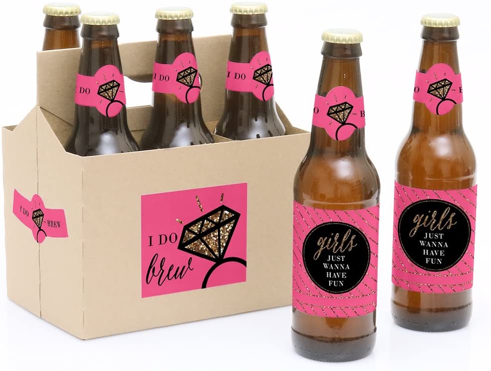 • Girls Night Out Beer Gift Set INCLUDES 6 beer bottle sticker labels & 6 bottle neck labels in the black, pink and gold bachelorette theme, as well as 1 six-pack carrier with 4 “I Do Brew” bachelorette party stickers for decoration.