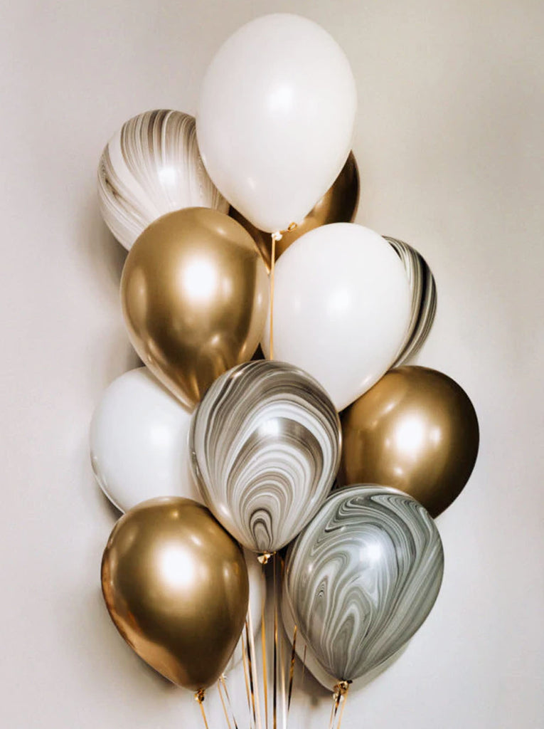 Gold Metallic Balloons & Black Marble Balloons Bouquet - 12 Balloons - With Helium is backordered and will ship as soon as it is back in stock.