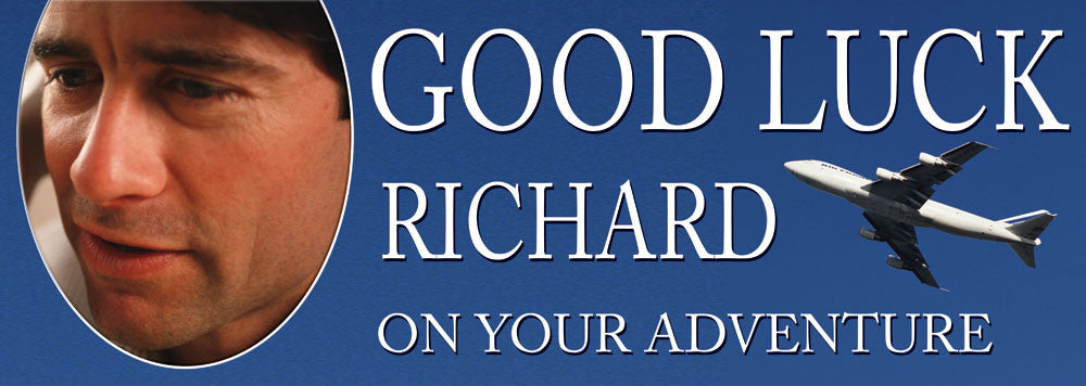 Personalised Good Luck on your Adventure banner, includes large picture over a background image of a plane in flight. Words can be changed to any destinations.