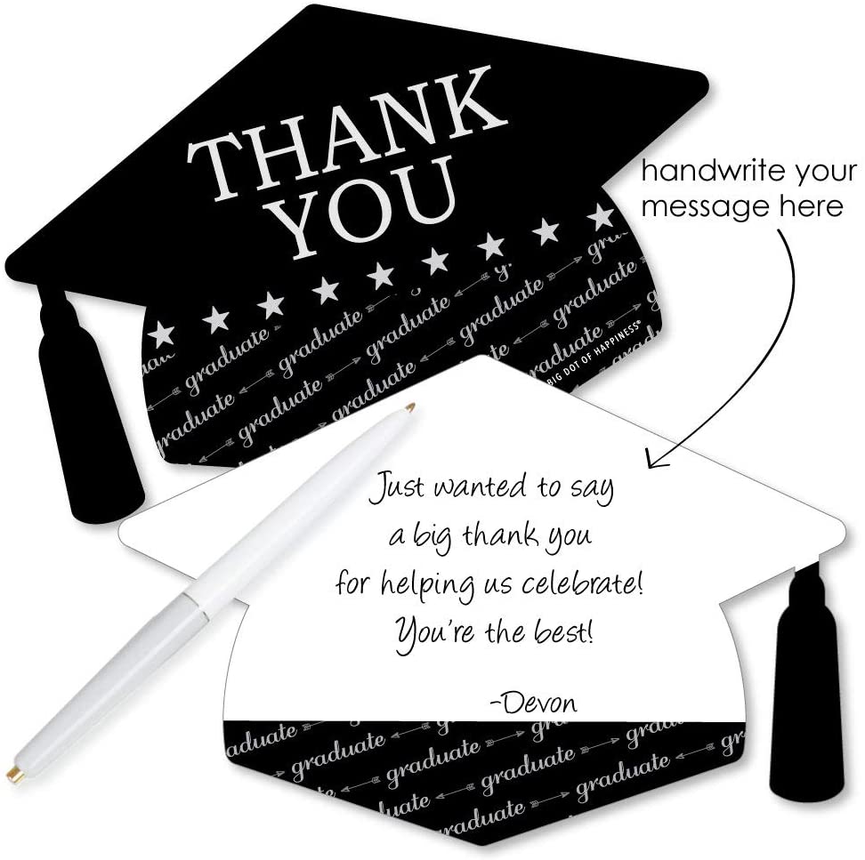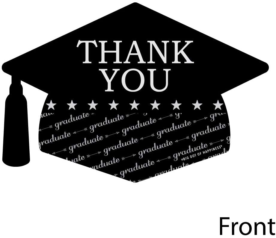 • Shaped Thank You Cards Set INCLUDES 12 Graduation Cheers grad party thank you cards and 12 premium white envelopes. Graduation Cap Shaped Thank You Cards are the perfect end to any event.