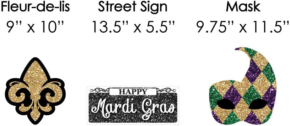 • PERFECT FOR ANY LOCATION! Mardi Gras - Masquerade Party - outdoor yard decorations MEASURE 9 inches x 10 inches (Fleu-de-lis); 13.5 inches x 5.5 inches (Street Sign); 9.75 inches x 11.5 inches (Mask). Masquerade party yard decor can be hung from trees and porches. Set of 10 Mardi Gras hanging decorations are also easy party decorations for indoors when hung from ceilings at school, work or home. Everyone will love these masquerade party supplies.
