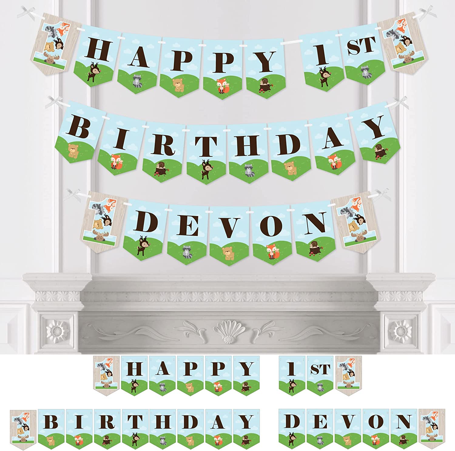 Happiness Personalized 1st Birthday Woodland Creatures - Custom First Birthday Party Bunting Banner and Decorations - Happy 1st Birthday Custom Name Banner is backordered and will ship as soon as it is back in stock.