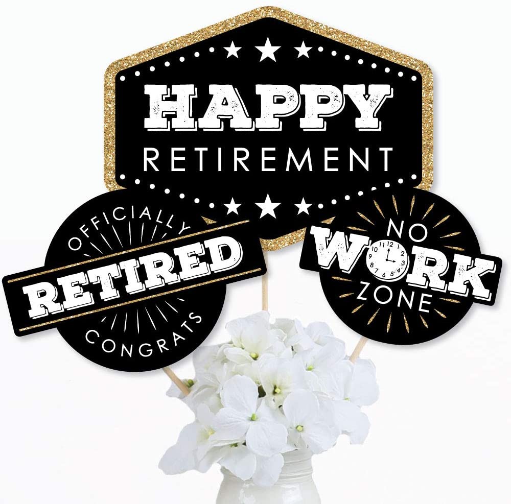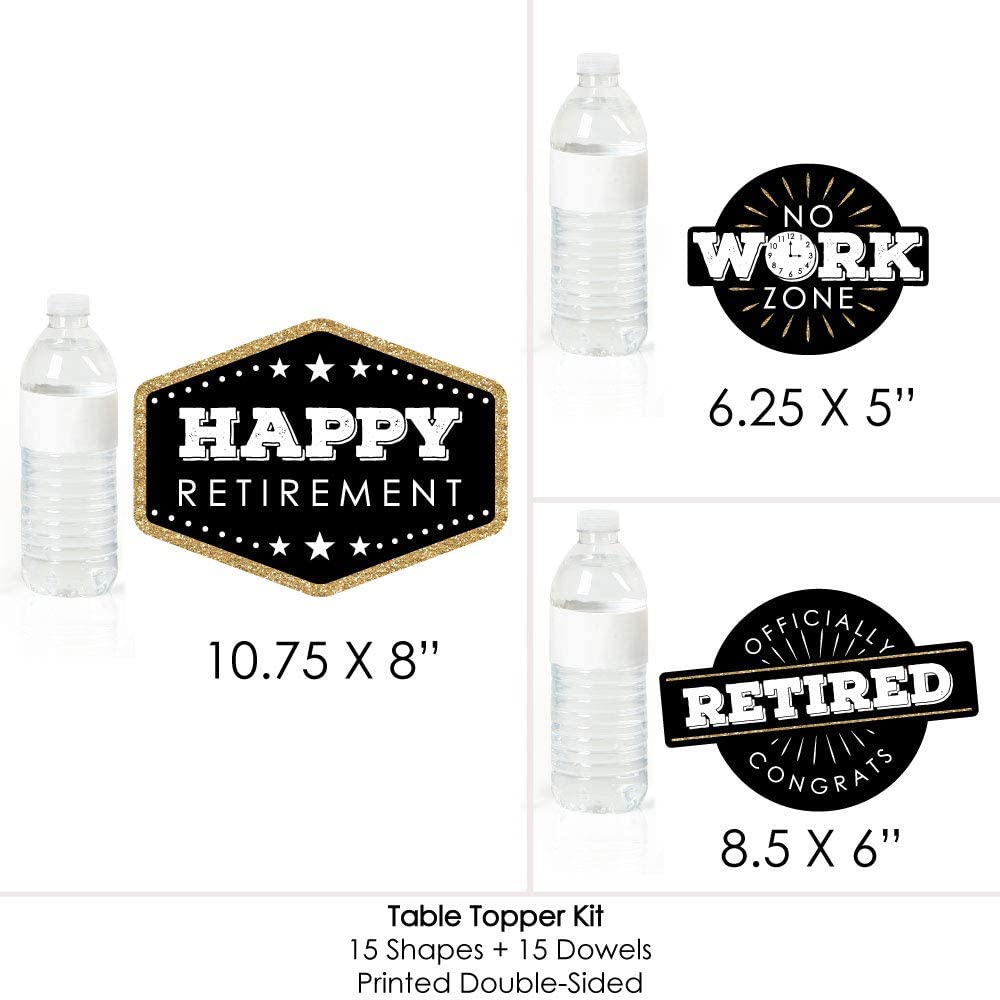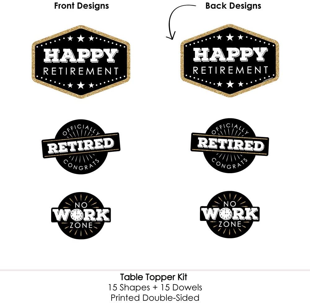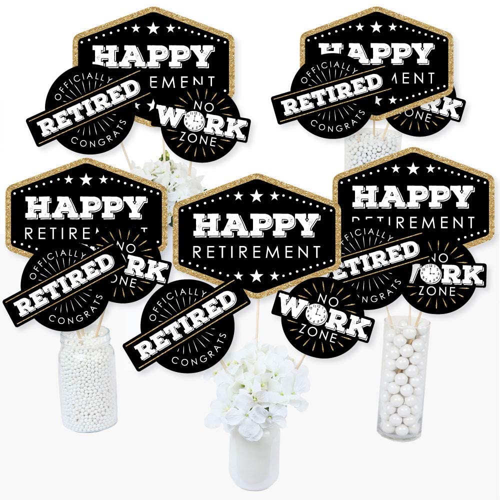 • Happy Retirement Centerpiece Sticks SIZE five happy retirement table toppers, 10.75” wide x 8” tall; five no work zone table toppers, 6.25” wide x 5” tall; and five officially retired congrats table toppers, 8.5” wide x 6” tall. The unique design and variety of pieces makes this table decoration kit an impressive addition to any retirement theme party.