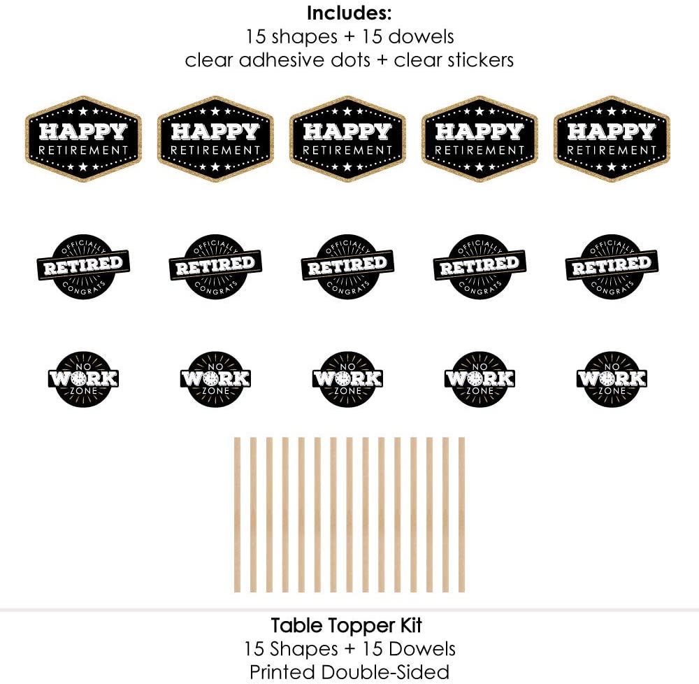 • Happy Retirement Centerpiece Sticks INCLUDES 15 black and gold table toppers in three different shapes, 15 wooden dowel sticks and stickers for easy assembly. Black and gold party table decorations are perfect for a retirement party.