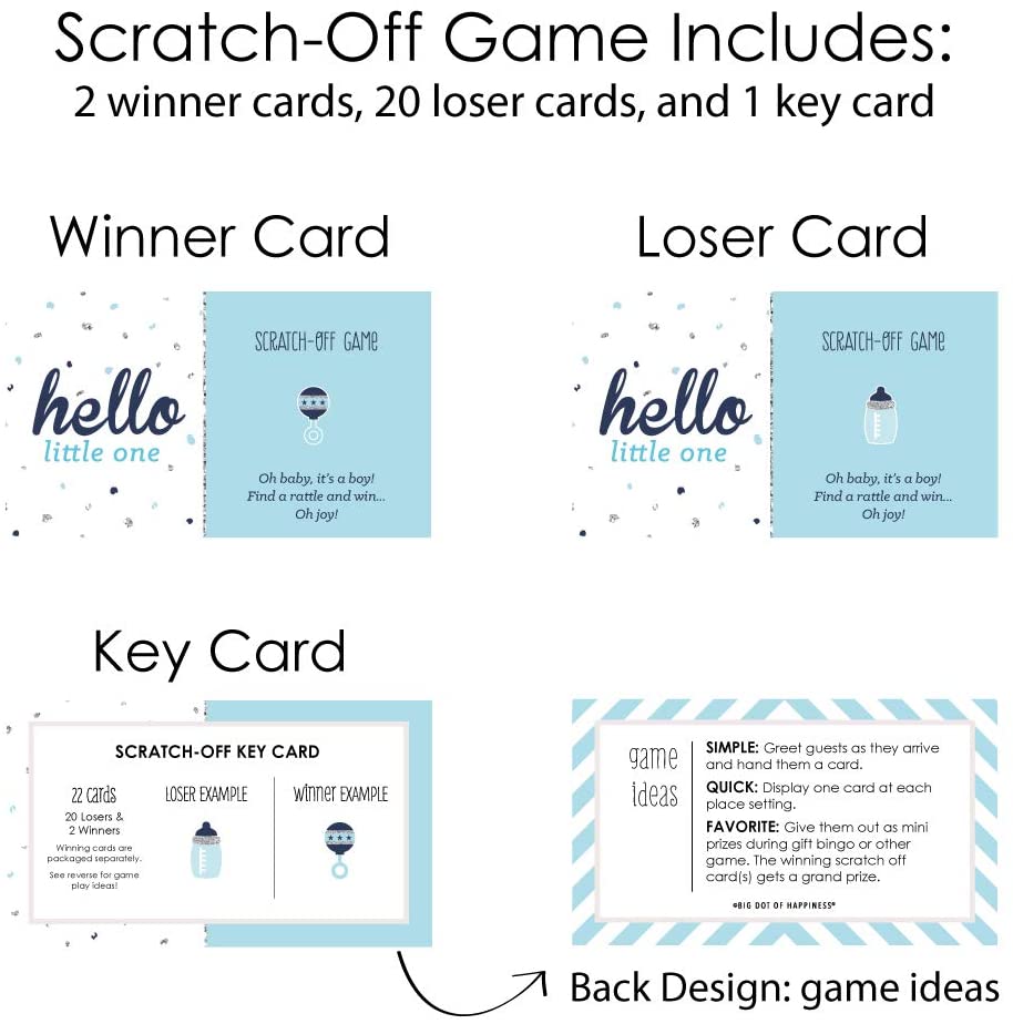 • FUN PARTY GAME: Hello Little One - Blue and Silver scratch-off cards will be enjoyed by baby shower guests of all ages. Each game card measures 2.75” tall x 4.75” wide. Winner and loser game cards are packaged separately so it is easy to pre-select the game winners if you choose.