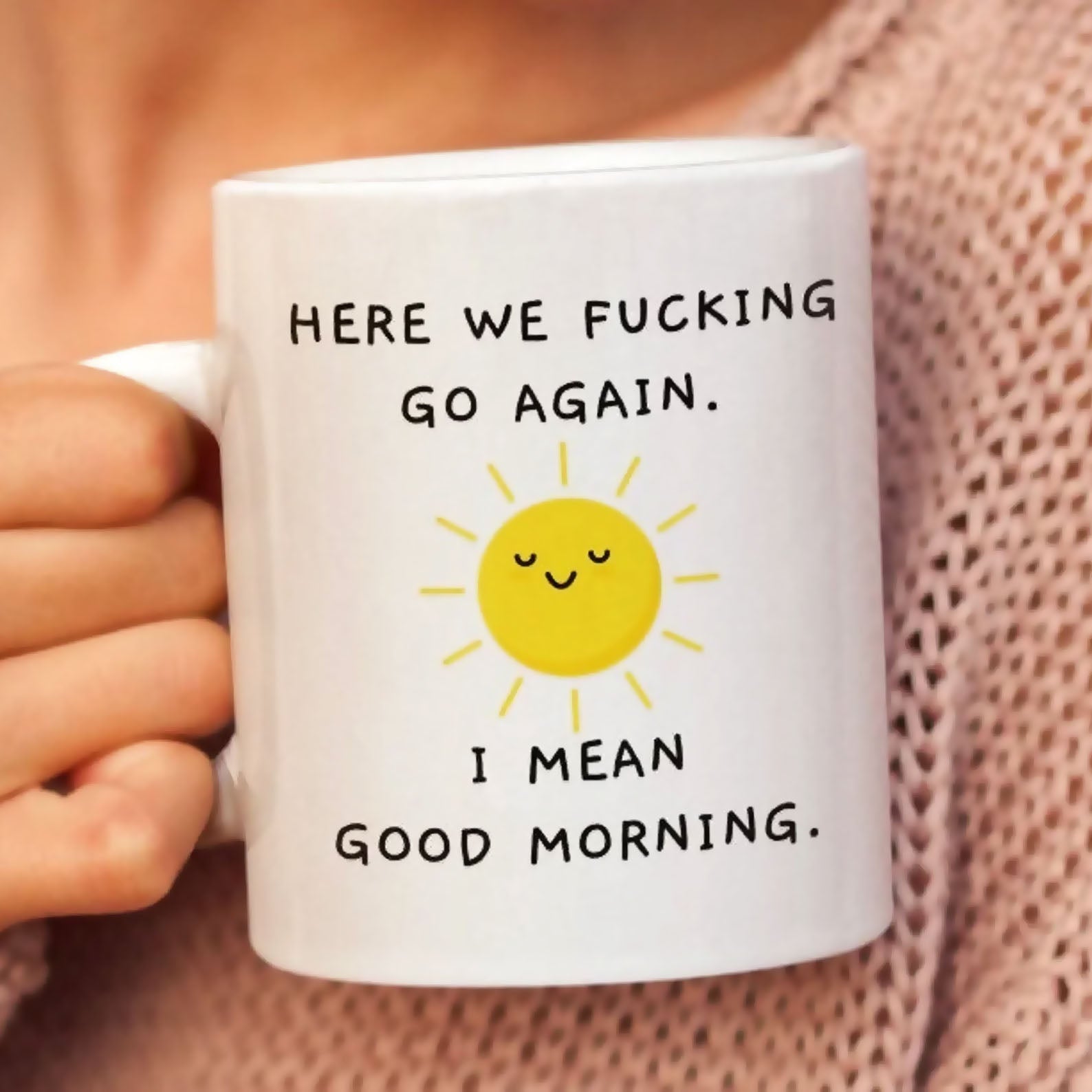 Here We Fucking Go Again Mug is backordered and will ship as soon as it is back in stock.