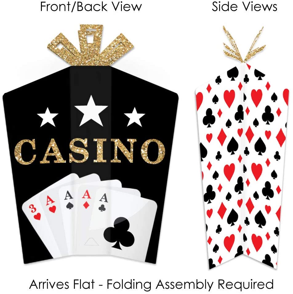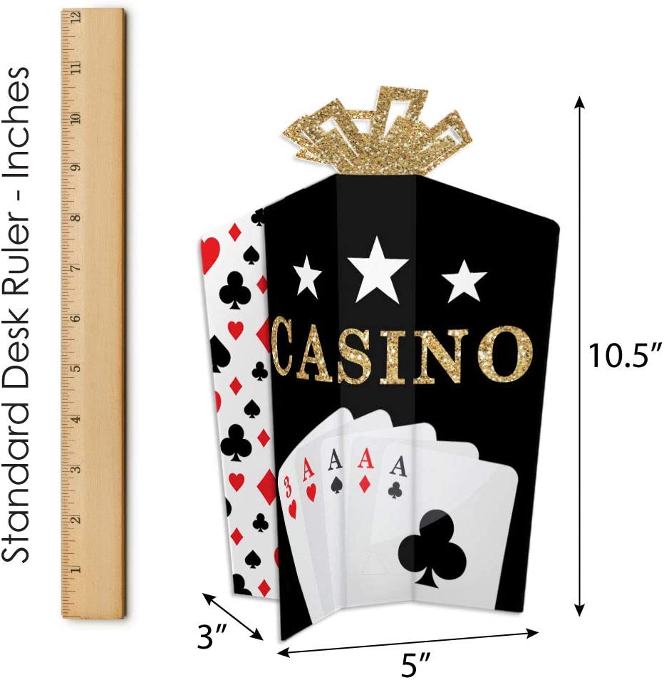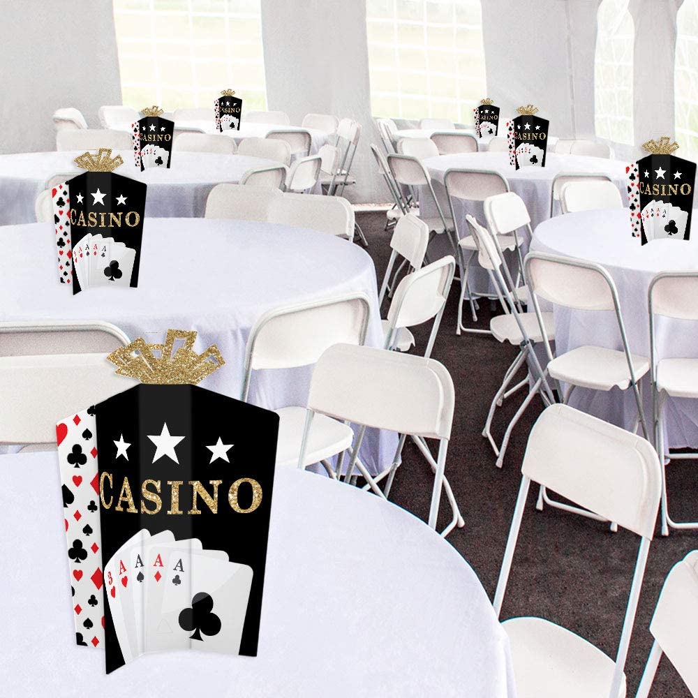 • EASY TABLE DECOR: Each Las Vegas - Casino centerpiece SIZE 5 inches wide (front/back) x 3 inches wide (sides) x 10.5 inches tall. This 10 count table decorations set requires easy folding to flare out each centerpiece at your desired look. Easy DIY folding assembly: Use a flat surface to fold along the scored creases to stand the centerpiece upright and be able to balance on its own.
