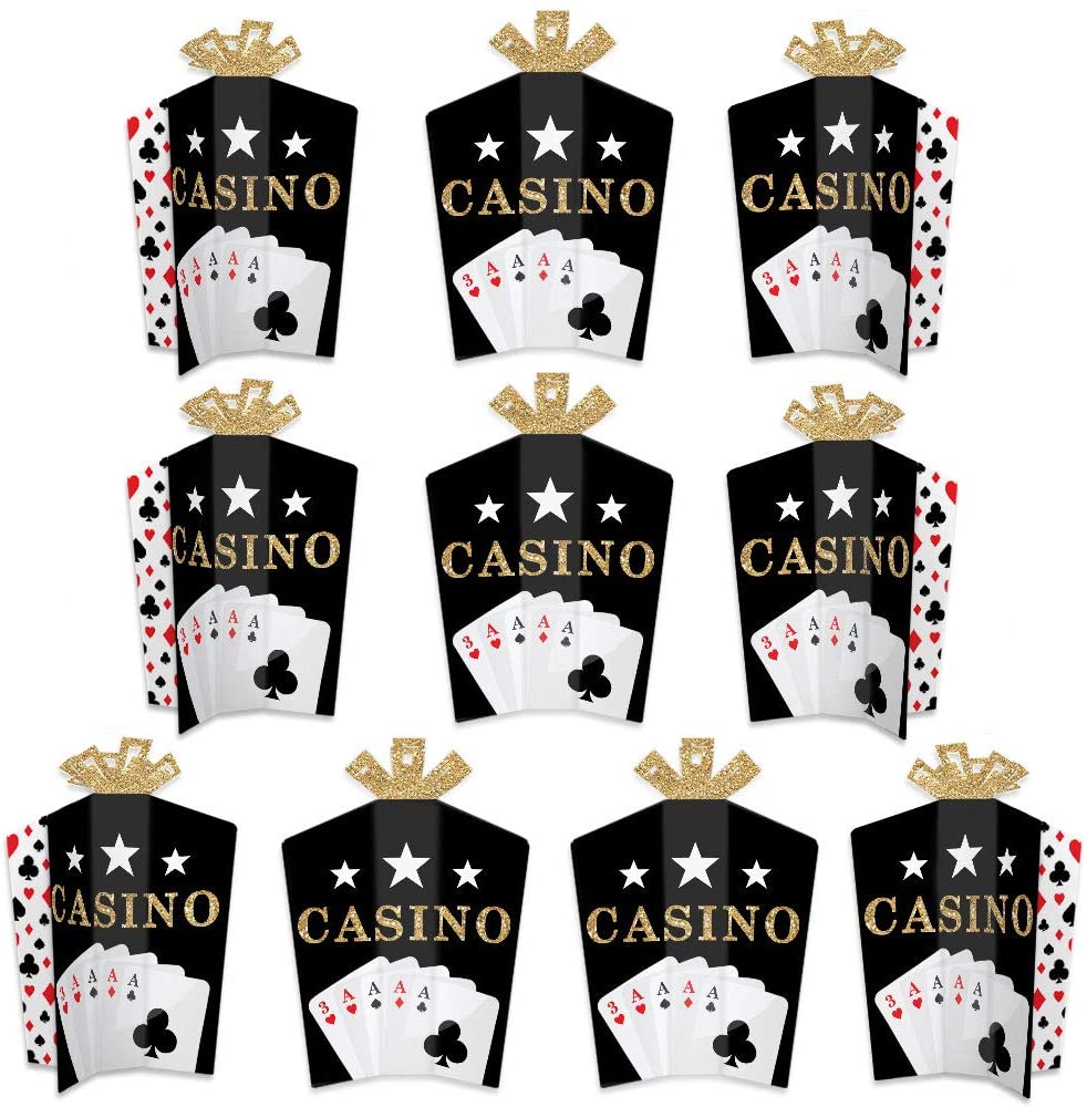 • Las Vegas - Casino Fold and Flare Centerpieces INCLUDE: 10 heavy-duty paper centerpieces in our Las Vegas - Casino theme. Each centerpiece has art on all four sides and starburst top for an impressive display. Some simple folding assembly required.