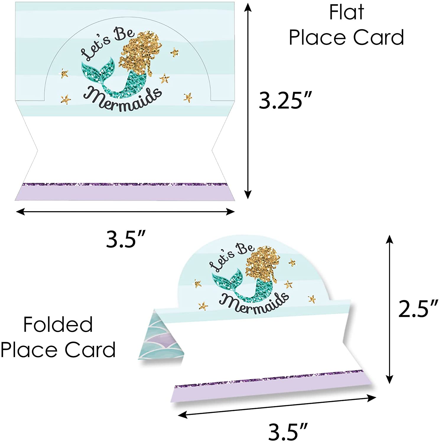• Let’s Be Mermaids Place Cards INCLUDES 24 individual cards that measure 3.5” wide x 2.5” tall when assembled. Easy to use, these tabletop accents are perfect to use at your next Baby Shower or Birthday Party.