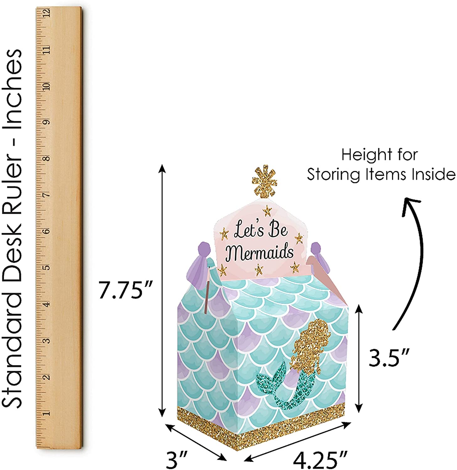 • Gable Boxes INCLUDE: 12 Let’s Be Mermaids-themed goodie party favor boxes. Each box SIZE measures 4.25 inches length x 3 inches width x 7.75 inches height. Gable favor boxes are ideal for small gifts and treats that are under 3.5 inches tall (height for storing items in closed box).