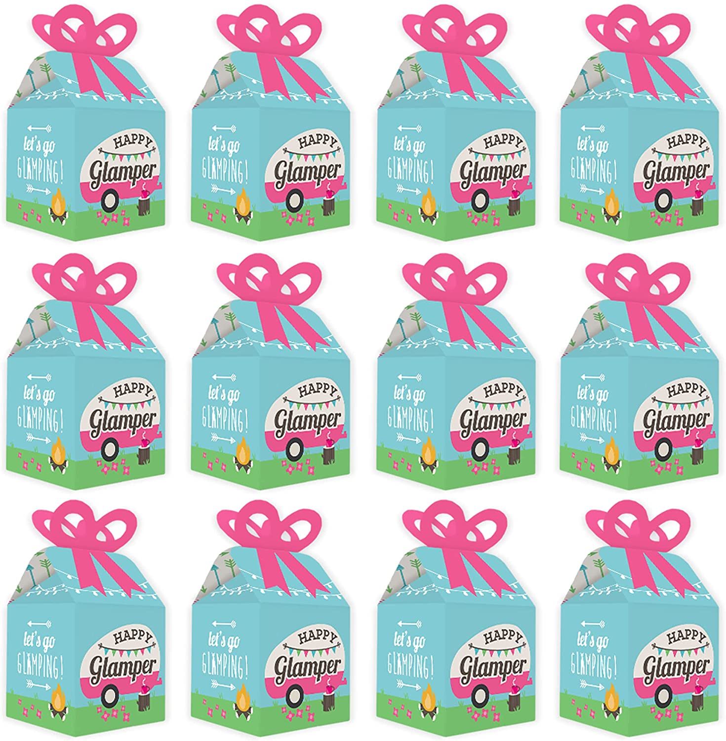 Let’s Go Glamping - Square Favor Gift Boxes - Camp Glamp Party or Birthday Party Bow Boxes - Set of 12 is backordered and will ship as soon as it is back in stock.
