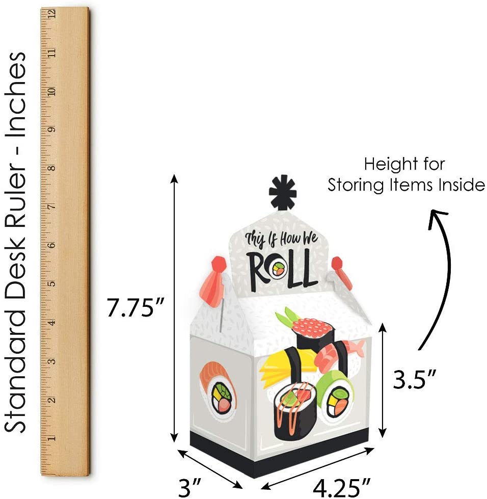• Gable Boxes INCLUDE: 12 Let’s Roll - Sushi-themed goodie party favor boxes. Each box SIZE measures 4.25 inches length x 3 inches width x 7.75 inches height. Gable favor boxes are ideal for small gifts and treats that are under 3.5 inches tall (height for storing items in closed box).