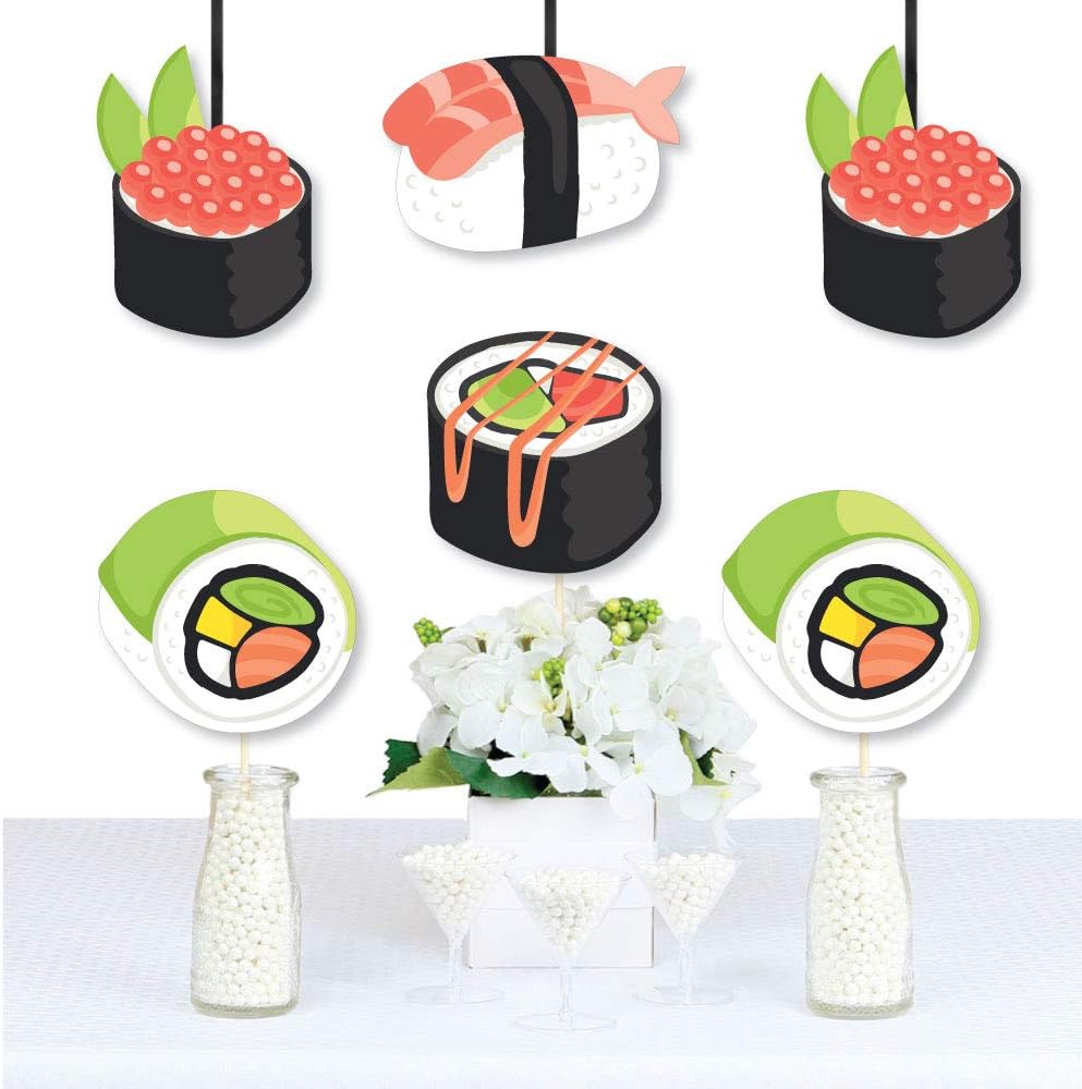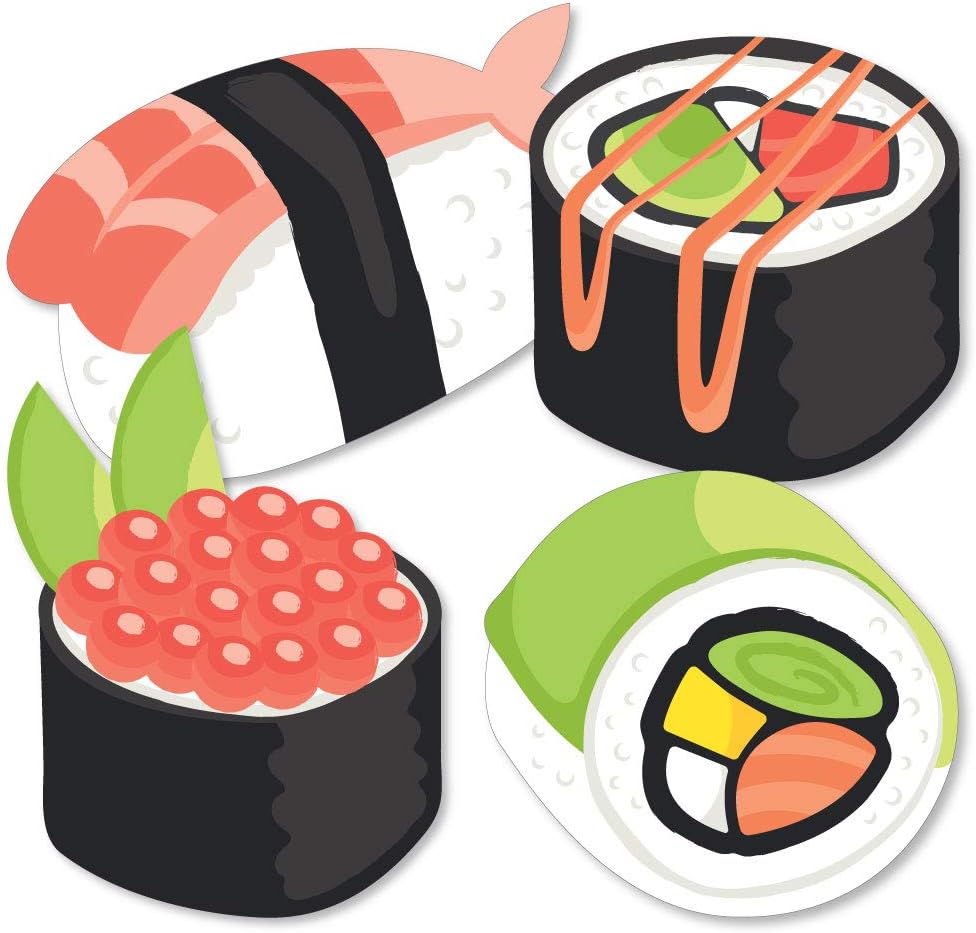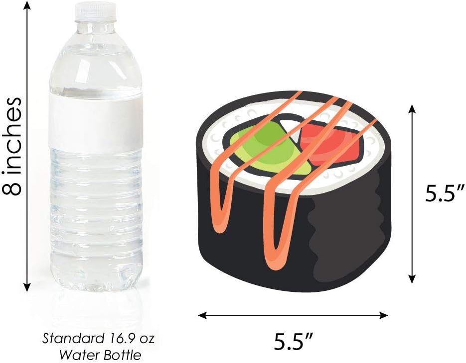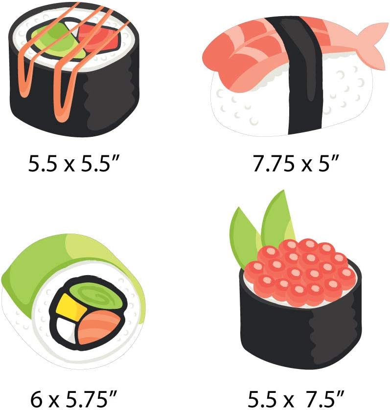 • DIY PARTY SUPPLIES: Let’s Roll - Sushi essentials include 20 large cut outs sushi shapes that coordinate with the party theme. Set of 20 sushi shapes SIZE 5 sushi shapes 5.5" x 5.5"; 5 sushi shapes 7.75” x 5”); 5 sushi shapes 6” x 5.75”; 5 sushi shapes 5.5” x 7.5”. The unique design and large size makes these party decorations an impressive addition to any Japanese baby shower or birthday party.